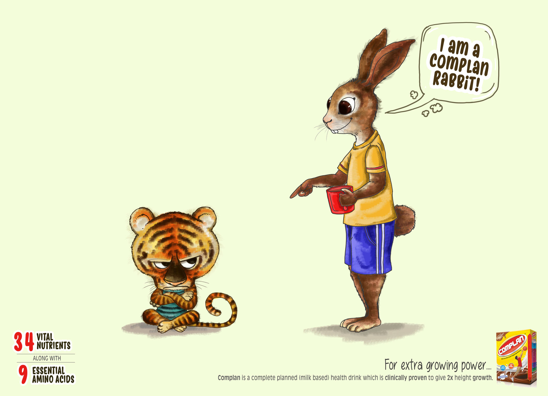 This campaign was a part of a self-initiated project done on Fantasy Advertisements. The brand has chosen for campaign was “Complan“. The tagline of the brand is “For extra growing power“, thus the campaign was designed in the series of same. The concept was to represent the childhood stories using the animal characters which amused us as kids. The inspiration was Panchatantra tales and their stories. The target audience was kids and that's why the illustration the style was developed for kids.