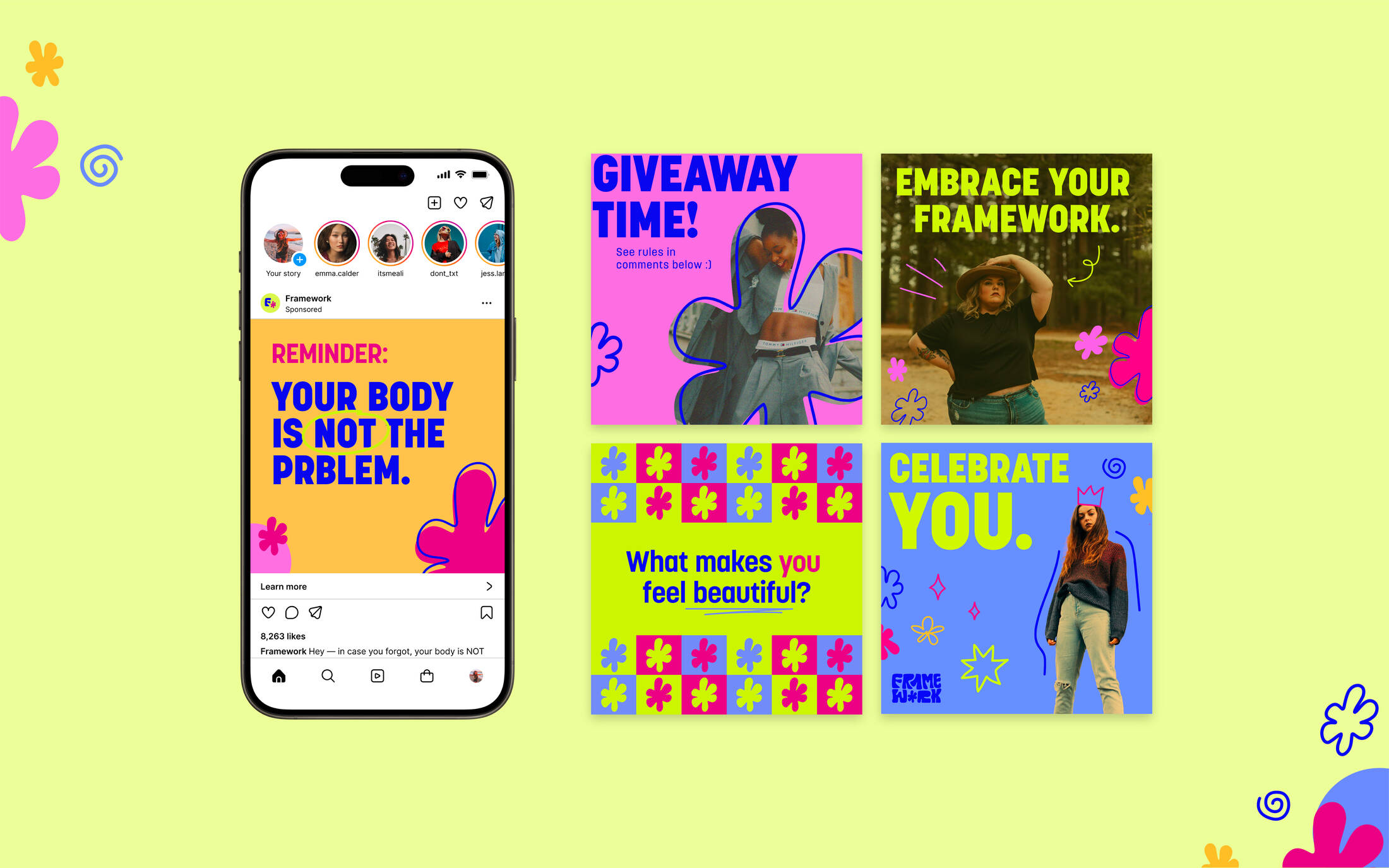 For print advertising, posters were developed in various sizes and orientations to represent the vast range of bodies, which come in all shapes and sizes. A social media presence was also created to promote body positivity, rally the community, post giveaways, and advertise clothing sold on the Framework app.
