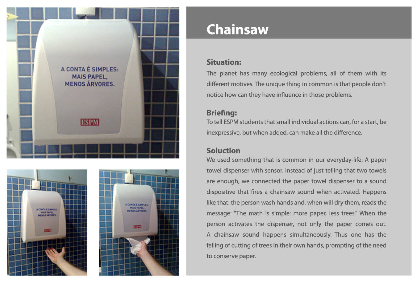 This professional campaign titled 'Chainsaw' was published in Brazil in March, 2010. It was created for the brand: ESPM, by ad agency: Staff. This Ambient medium campaign is related to the Public Interest industry and contains 1 media asset. It was submitted over 15 years ago.
