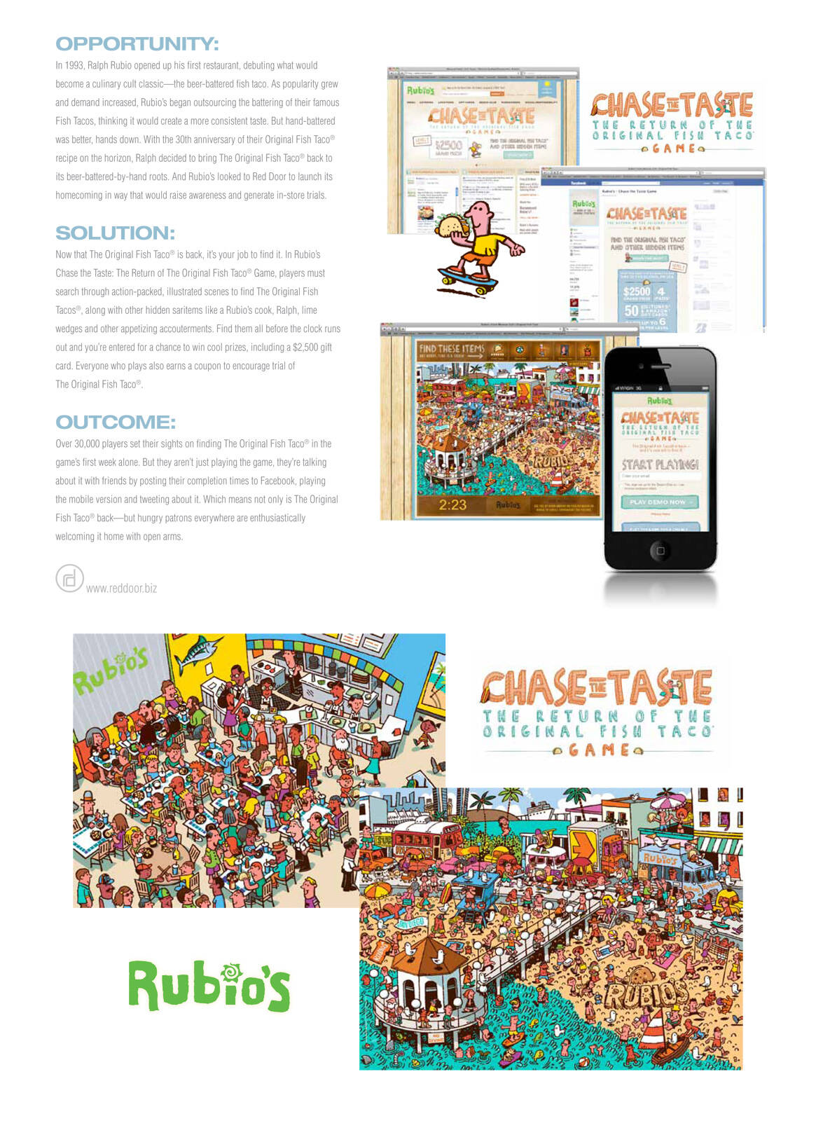 This professional campaign titled 'Chase the Taste, The Return of the Original Fish Taco' was published in United States in August, 2011. It was created for the brand: Rubio's, by ad agency: Red Door. This Digital medium campaign is related to the Food industry and contains 1 media asset. It was submitted about 14 years ago.