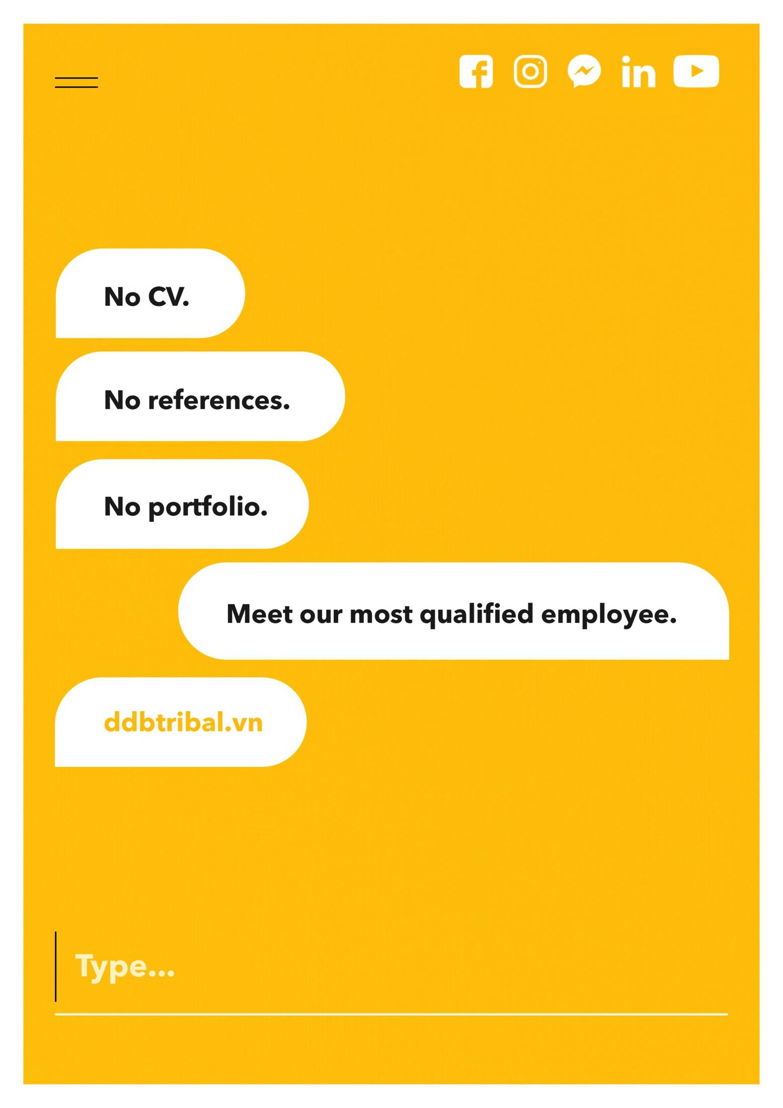 I am blue by morning. Green by noon. And grey by night. What am I? Ahem! I’m DDB & Tribal Vietnam’s new chatbot. Sure, I can do a lot more than just change background colours. I can show you our work, connect you to our social media pages and put you in touch with our Managing Director. Some may even say I have a lot of power in my hands. Speaking of hands, I don’t have any. But I am armed with a lot of pickup lines. And when I’m not busy listening to hardcore death metal, I like regaling internet strangers with tales about our agency. If you pop over looking for funny cat videos, I won’t bother saying hello. By the by, have you seen that cat doing that little cat thing on Instagram? Ha. To keep me company, check out ddbtribal.vn