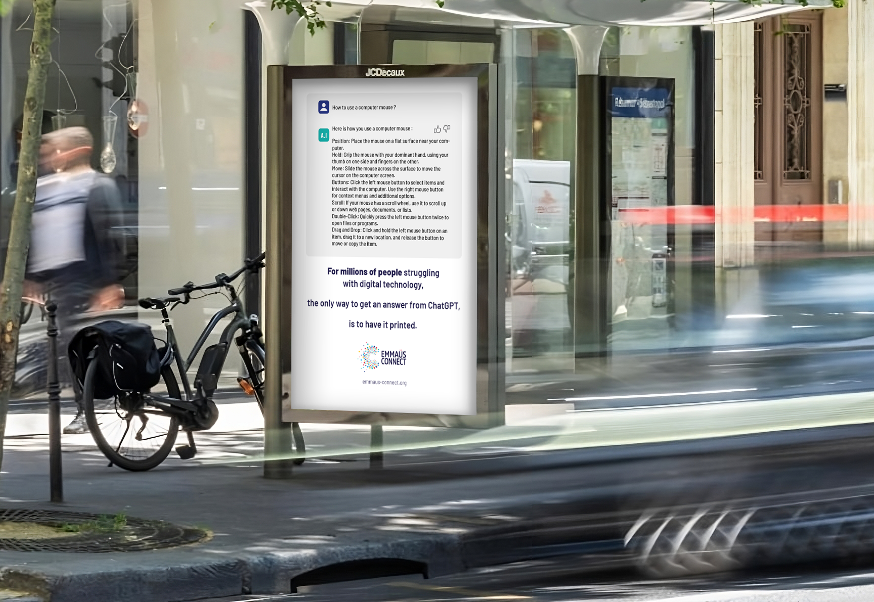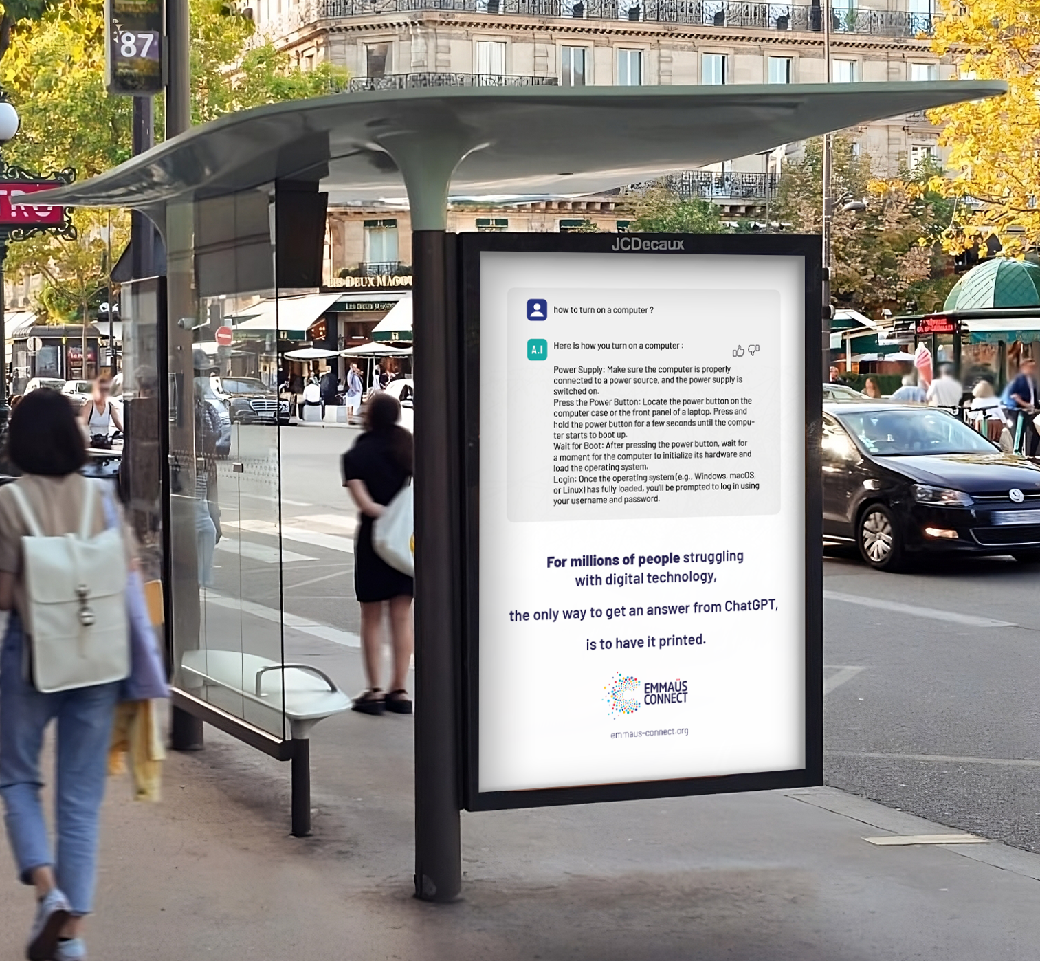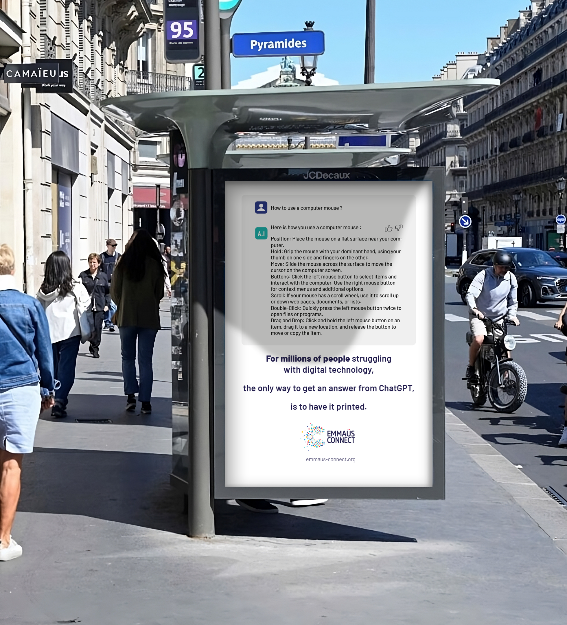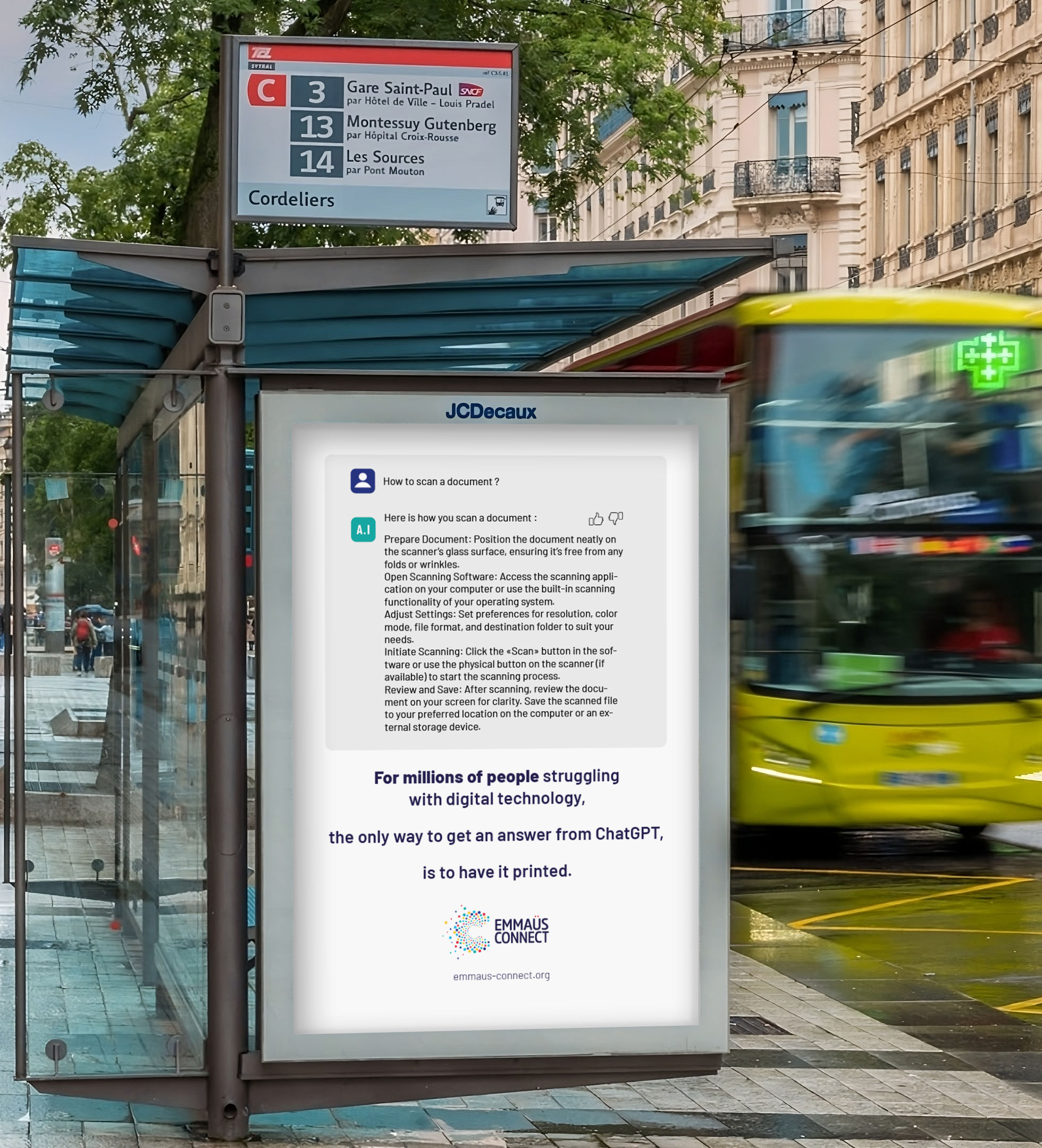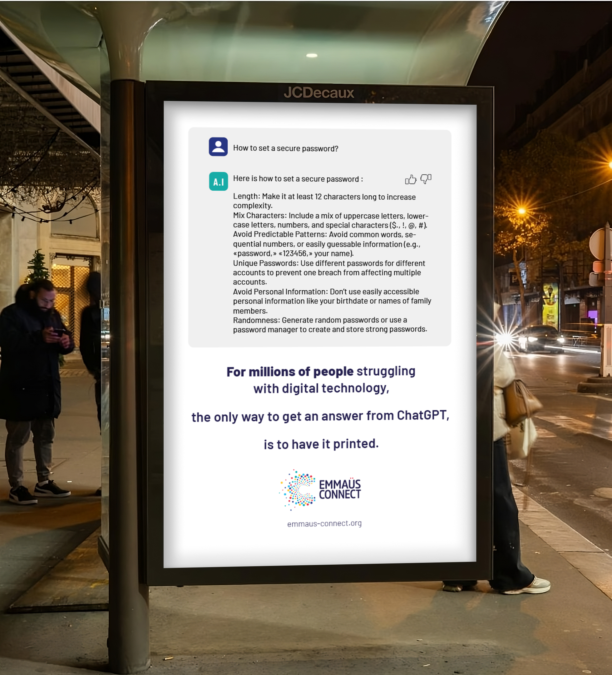 Turning on a computer, using a mouse, scanning a document... choosing a secure password: so many tasks that ChatGPT could help to understand, if only the people who would benefit from these tutorials knew how to access them. This is why we printed ChatGPT to make it accessible to people who are suffering from this digital divide.