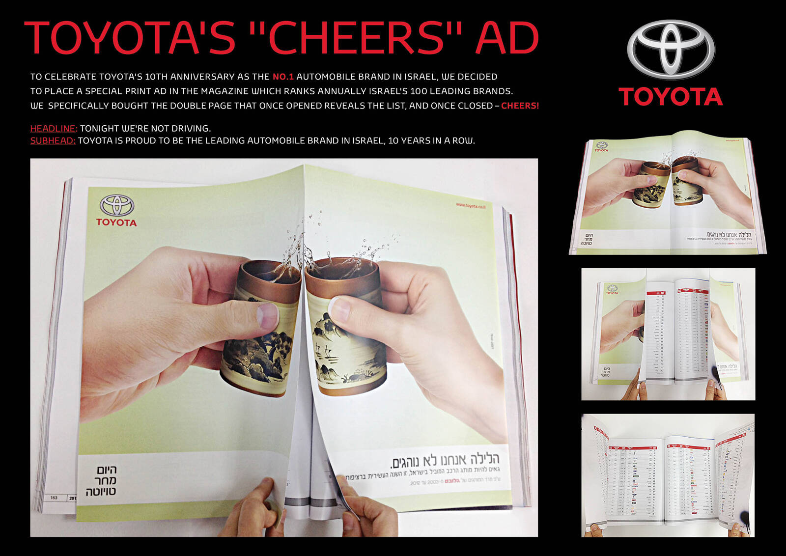 This professional campaign titled 'Cheers!' was published in Israel in July, 2012. It was created for the brand: Toyota, by ad agency: TBWA. This Print medium campaign is related to the Automotive and Personal Transportation industry and contains 1 media asset. It was submitted over 13 years ago.