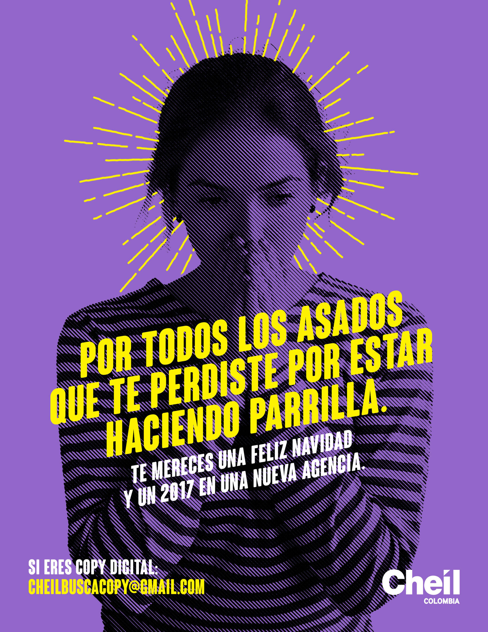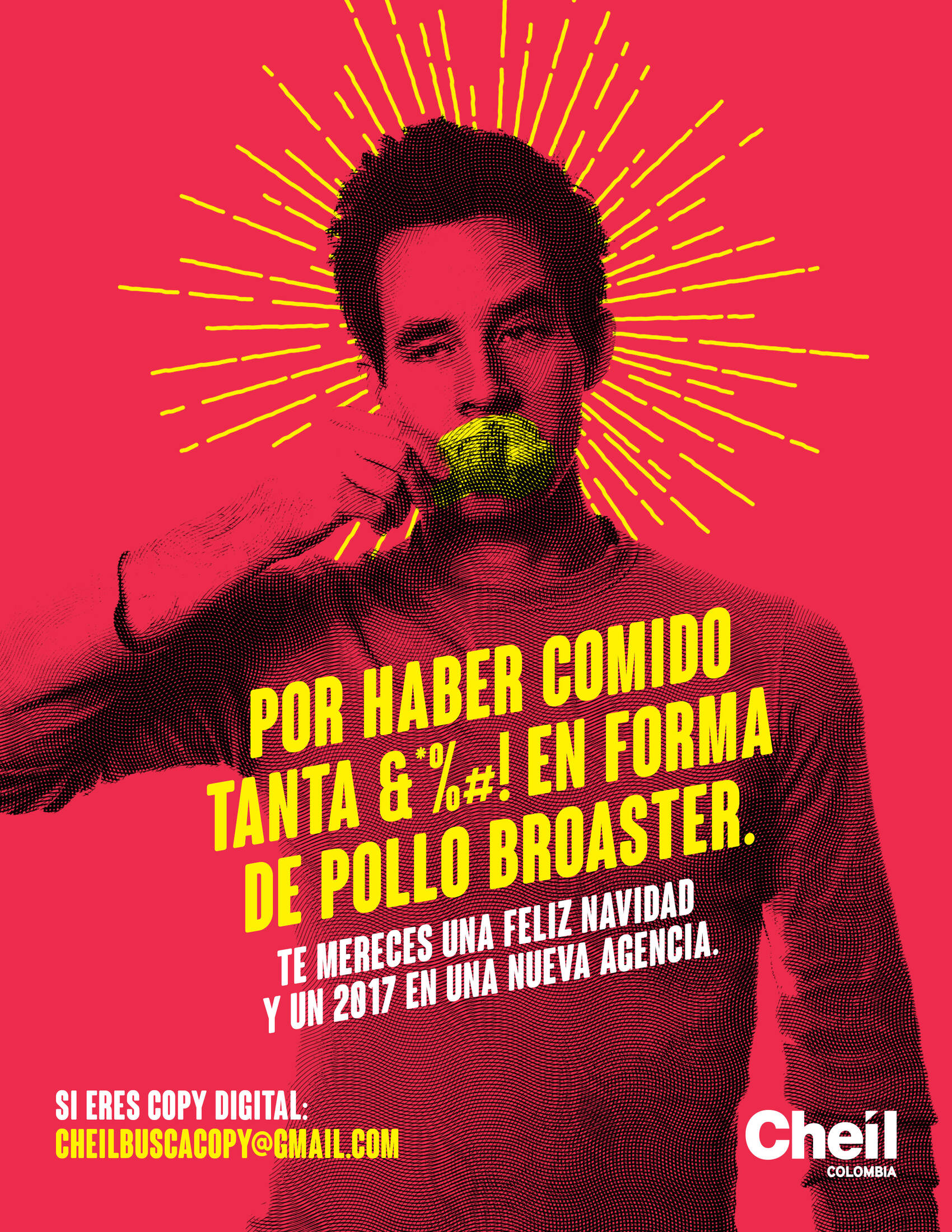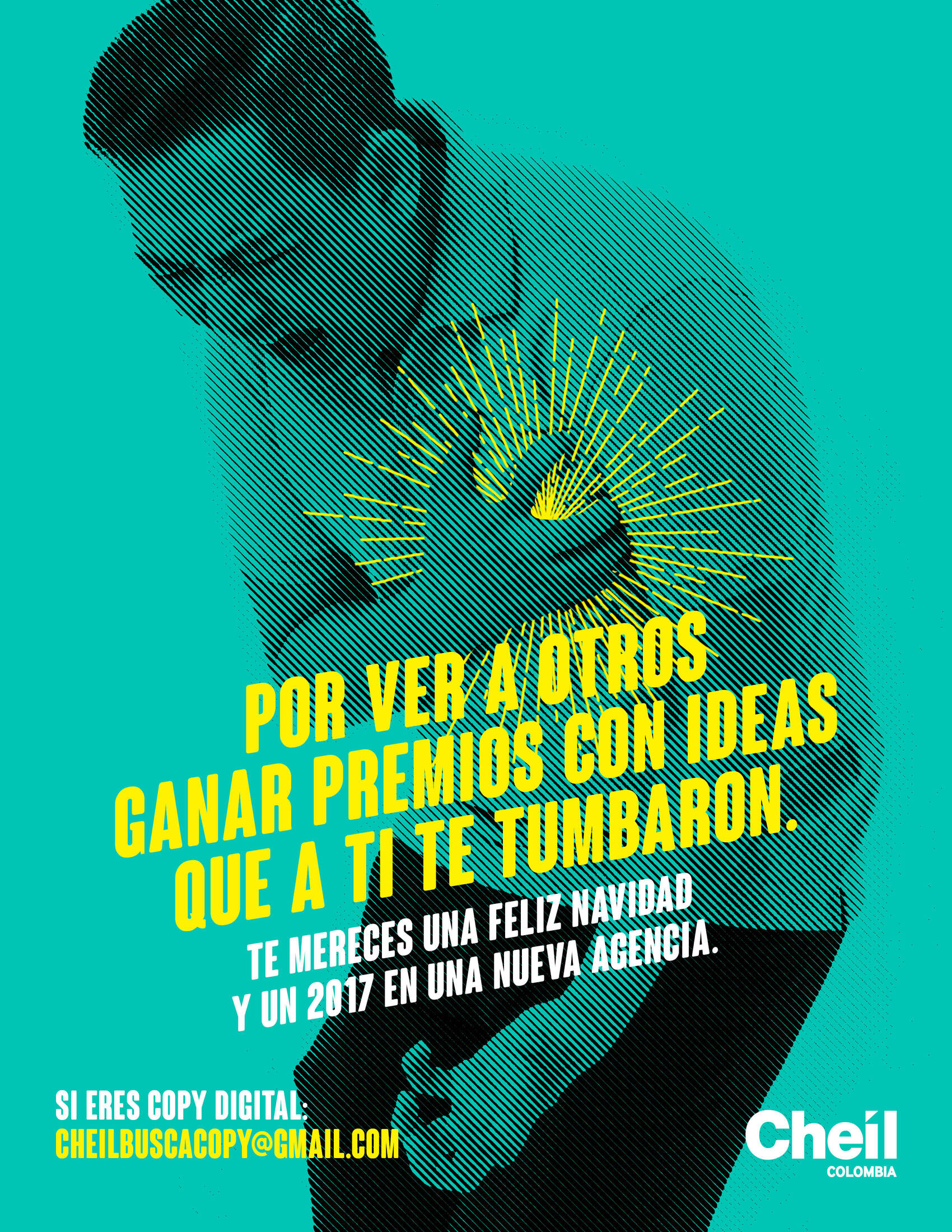 This professional campaign titled 'Cheil Colombia is looking for a copy' was published in Colombia in December, 2016. It was created for the brand: Cheil, by ad agency: Cheil. This Digital medium campaign is related to the Agency Self-Promo industry and contains 4 media assets. It was submitted almost 9 years ago.