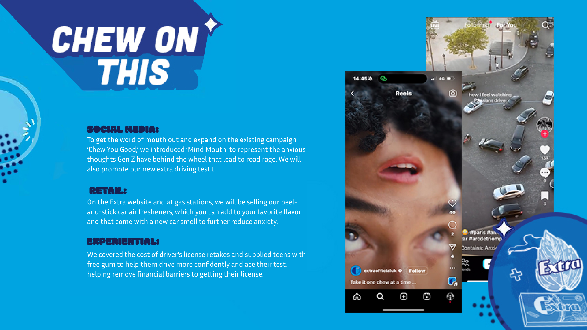 The driving test was once a rite of passage that meant freedom from parental drop-offs is now left in the rearview. With ride-sharing up and driving anxiety on the rise, only 40% of teens have their license. 54% fail on the first try, and when they do pass, Gen Z top the road rage charts. Extra helps Gen Z drivers make the road a less stressful and more accessible place. Through sales of our new rearview pack, we funded driving test retakes to remove financial barriers to getting a license. And with a TikTok trend that gives road rage something to chew on, we showed young drivers how something as simple as gum can help them keep their cool and get there safely.