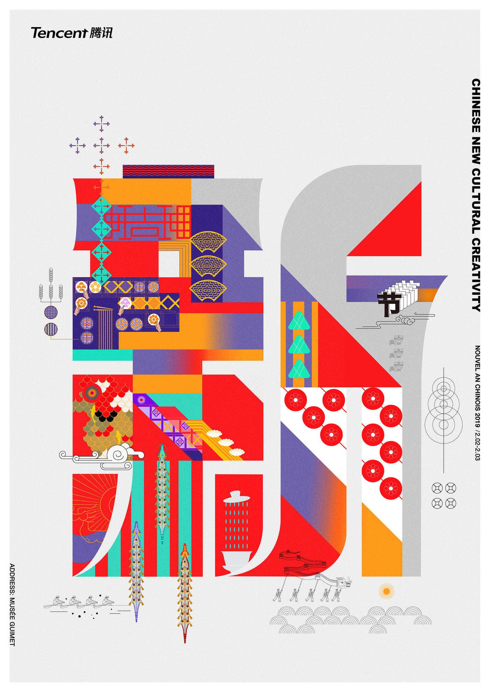 Background Tencent hosted the exhibition of Chinese Cultural and Creative in the Musée Guimet in France by means of Chinese New Year early this year, which reflects the behind story of Chinese culture and the innovation in new cultural visual form. Idea For this event, we have designed a series of posters to promote the exhibition "Chinese New Cultural Creativity ". In overseas, people often think that Chinese cultural elements are these ancient cultural forms, but this time, we take our imagination to capture and to symbolize traditional cultural forms with modern design language. Posters integrate festivals, food, clothes & accessories, crafts, architecture, gardens and other cultural symbols in Chinese culture into the Chinese characters “New", “Culture” and “Creativity". With a relatively modern design style, we want to bring the new Chinese cultural charms to the wider audience.