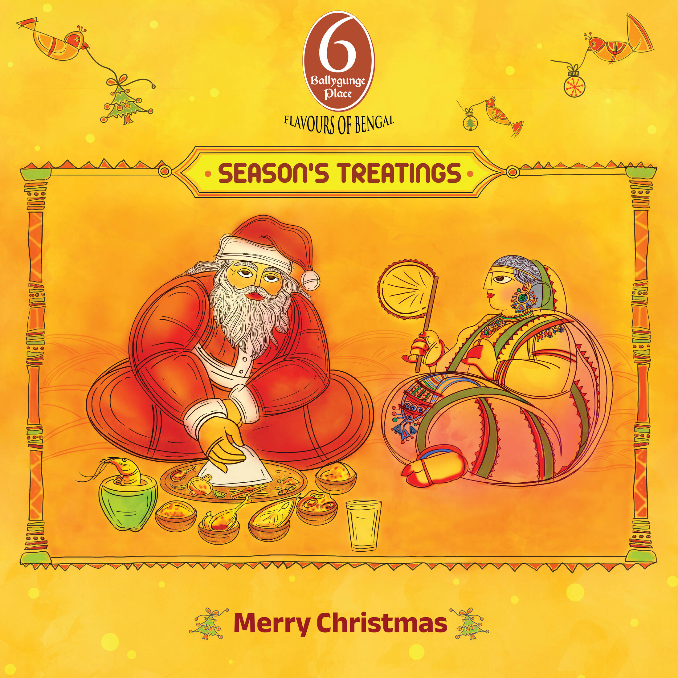 For Bengalis, Christmas comes with a different flavour. Borodin, as Bengalis love to call it, is a year-end celebration of food, fun and camaraderie. We have depicted the homecoming of Santa Claus and made him an integral part of the food galore. Clubbing this metaphor with Jamai Ador, a ritual during Jamai Sasthi where the son-in-law is presented with a mountain of food, we've shown how Santa cannot resist the spread offered at 6 Ballygunge Place.