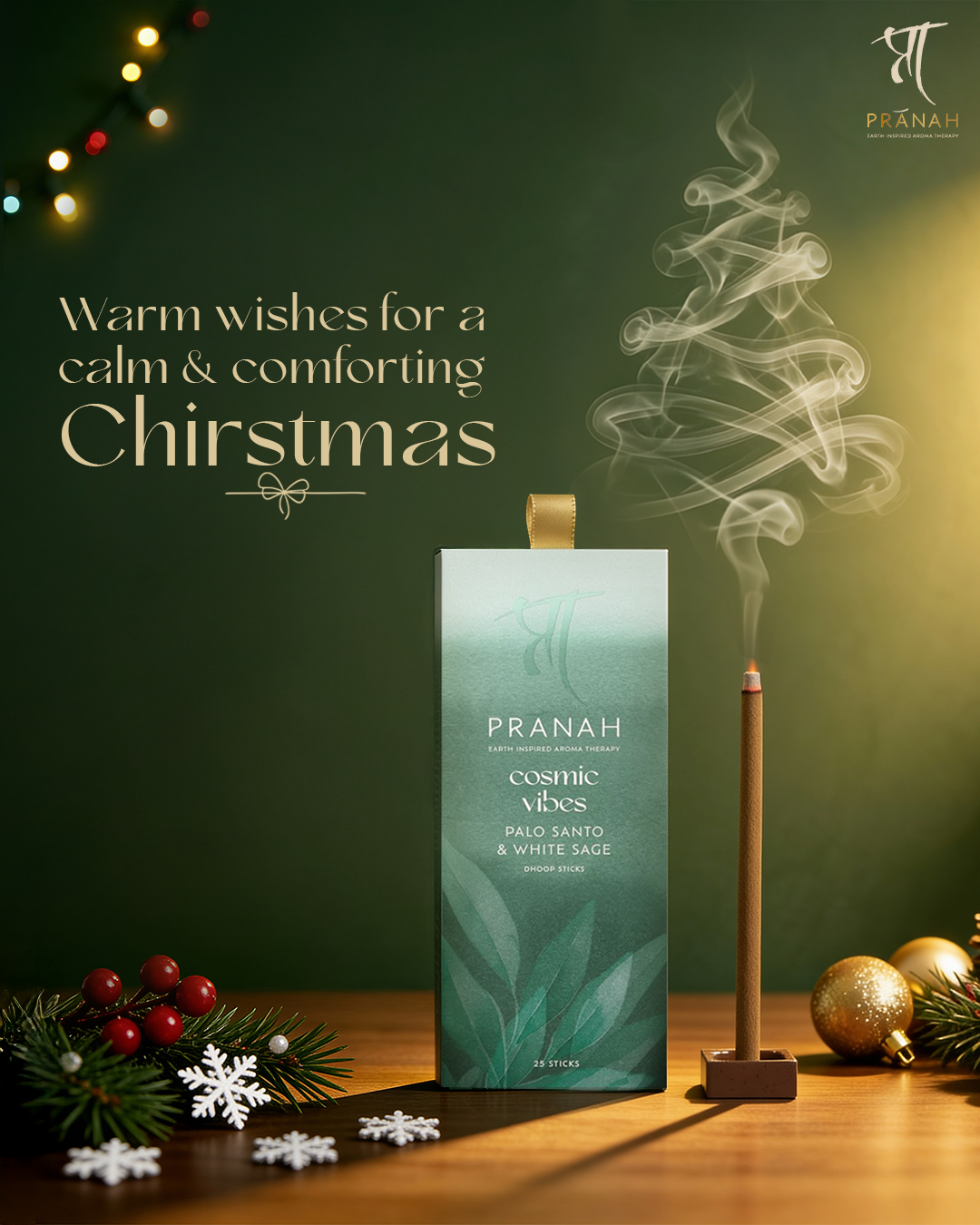 This Christmas visual for Pranah reinterprets the festive tree through rising incense smoke, transforming fragrance into form. As the dhoop stick burns, its smoke gently shapes a Christmas tree, symbolising warmth, calm, and mindful celebration. The minimal setting and soft lighting shift the focus from excess to stillness, positioning the ritual of fragrance as a moment of pause during the festive rush.