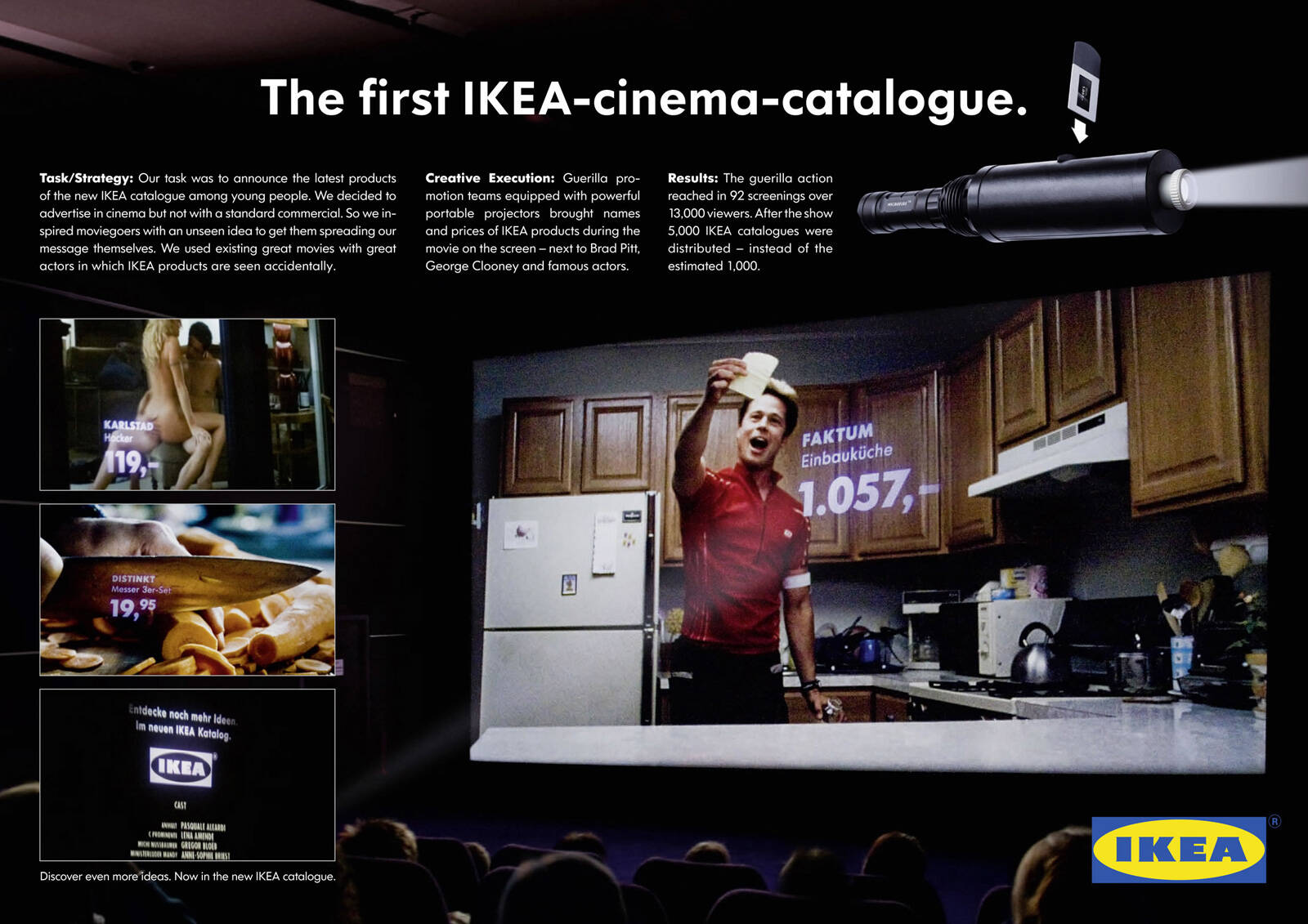 Guerilla promotion teams equipped with powerful portable projectors brought names and prices of IKEA products during the movie on the screen – next to Brad Pitt, George Clooney and other famous actors. This surprising execution fits perfectly to the IKEA principle: surprise the many people with fresh ideas for everybody’s everyday life. After the show we consequently distributed IKEA catalogues in front of the cinema.