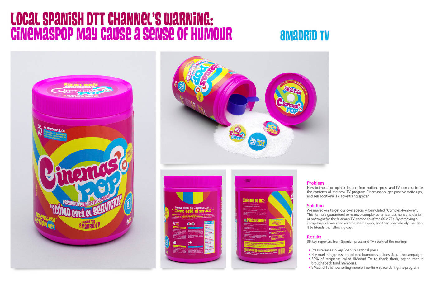 This professional campaign titled 'Cinemaspop Complex Remover' was published in Spain in March, 2008. It was created for the brand: Cinemaspop, by ad agency: Arnold. This Static Images medium campaign is related to the Media industry and contains 1 media asset. It was submitted over 17 years ago.