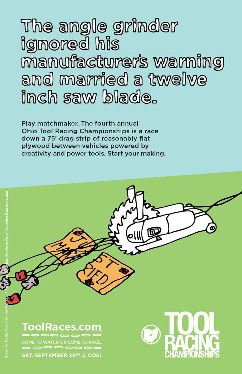 This professional campaign titled 'Circular Saw, Belt Sander, Angle Grinder' was published in United States in July, 2012. It was created for the brand: Ohio Tool Racing Championships, by ad agency: Adcom. This Print medium campaign is related to the Recreation, Leisure industry and contains 3 media assets. It was submitted over 13 years ago.