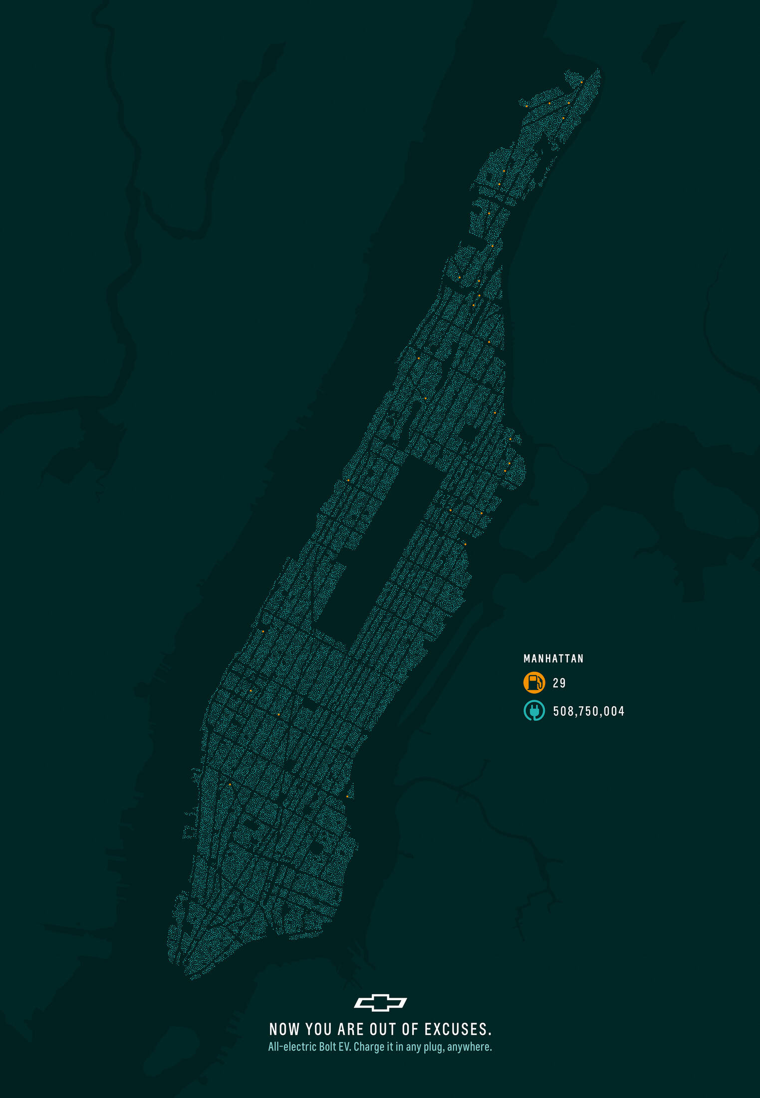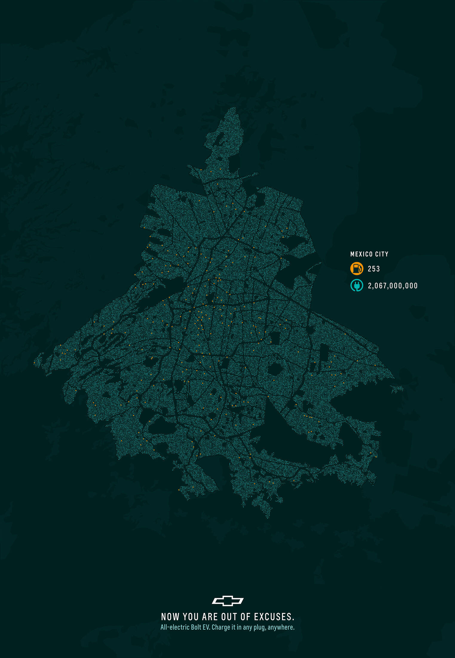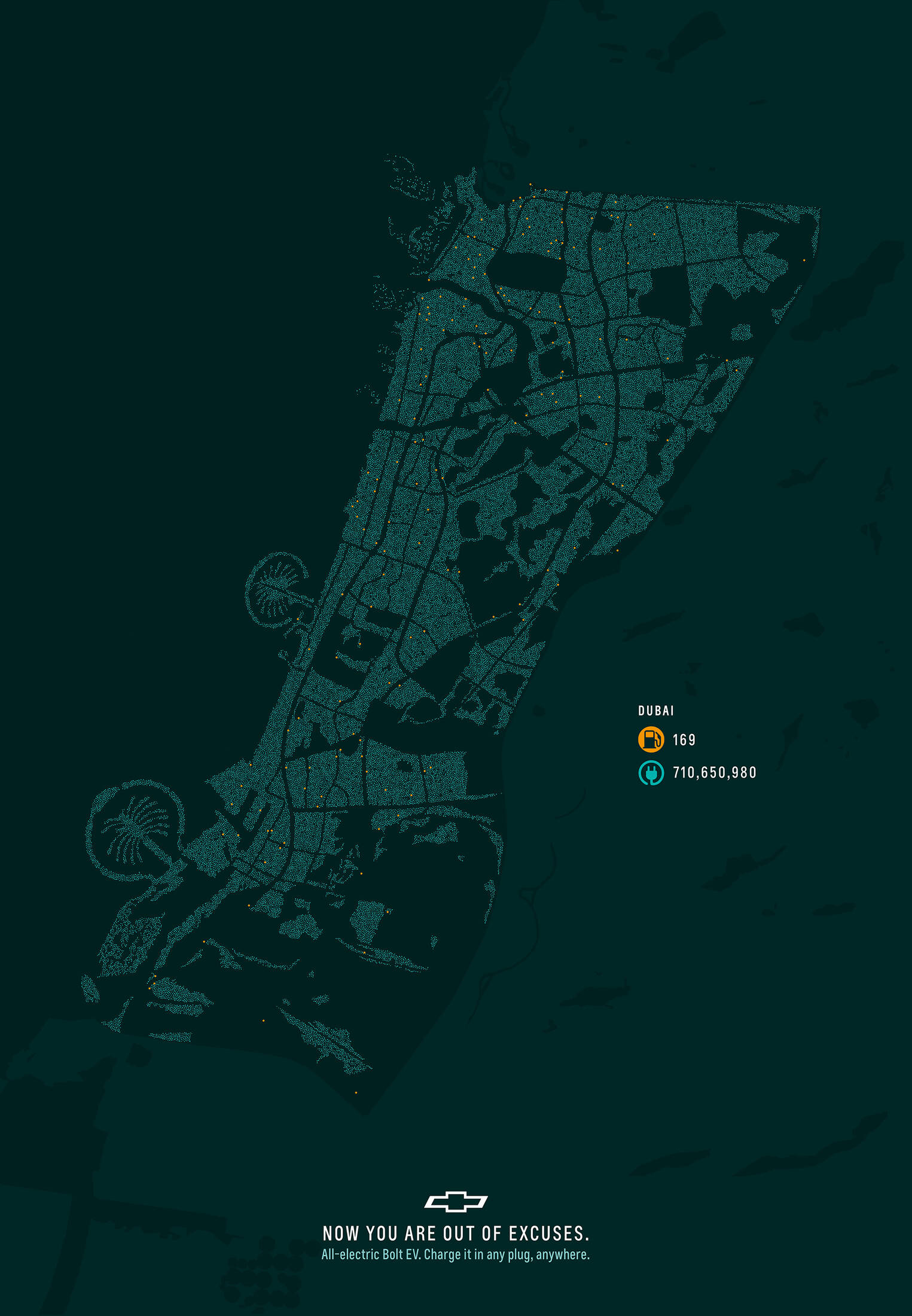 Using satellite maps and Google technology, we identify all gas stations in each city and exposed the real benefit of using an electric car in places as different as Manhattan or Dubai. People are unaware that there are enough charging points (regular plugs) in most major cities. The prints/ posters proved there is no reason to fear, you will always have a place to charge your vehicle. No excuses left.