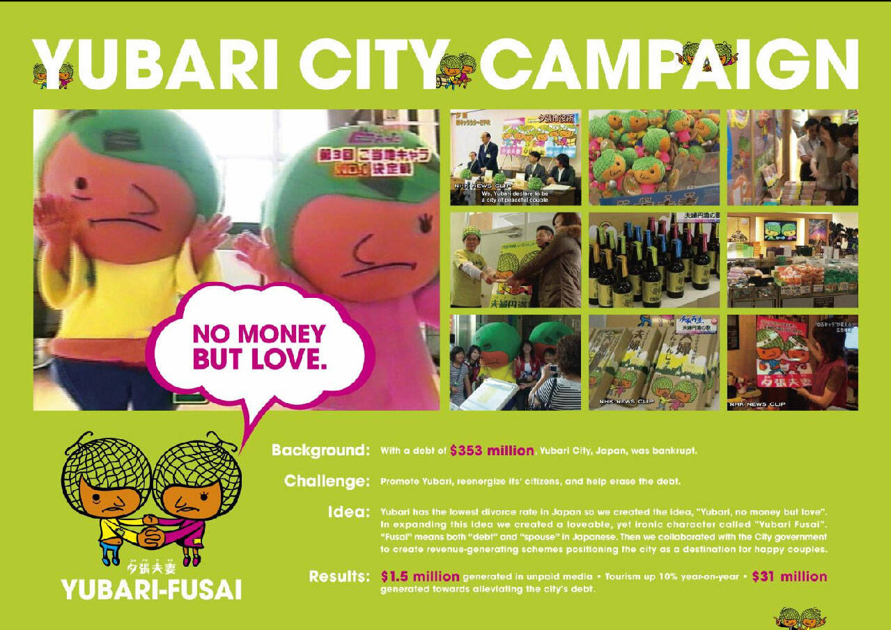 With a debt of $353 million, Yubari City in Hokkaido, Japan, went bankrupt in 2007. Our challenge was to promote Yubari, reenergize its citizens, and help erase the debt burden. Our PR strategy focused on the fact that Yubari boasted the lowest divorce rate in the whole of Japan and as such we created the idea, 'Yubari, no money but love.' In expanding this idea we created a couple of loveable, yet slightly ironic characters called 'Yubari Fusai'. “Fusai” means both “debt” and “married couple” in Japanese. Then we collaborated with the City Government to create a series of schemes positioning the city as a destination for happy couples – one of the many promotional schemes we initiated was the formation of Department of Happily Married Couples issued official Happily Married Certificates. Important to our strategy was the need to be upbeat and positive, protecting the sensitivities of the local residents, ensuring that our efforts didn’t demean them in any way. The idea of “no money but love” was an honest, yet endearing articulation of the situation they faced. Added to which, and in a country obsessed by cute characters such as Hello Kitty, the Yubari Fusai icon, proved to be a potent vehicle in generating WOM, print and broadcast PR.