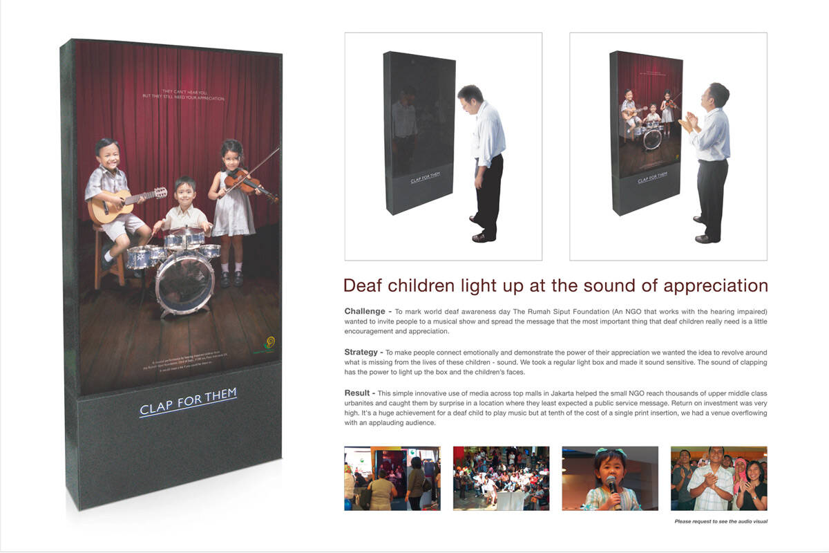 This professional campaign titled 'Clap activated light Box' was published in Indonesia in May, 2007. It was created for the brand: Rumah Siput Foundation, by ad agency: JWT. This Ambient medium campaign is related to the Public Interest industry and contains 1 media asset. It was submitted over 17 years ago.