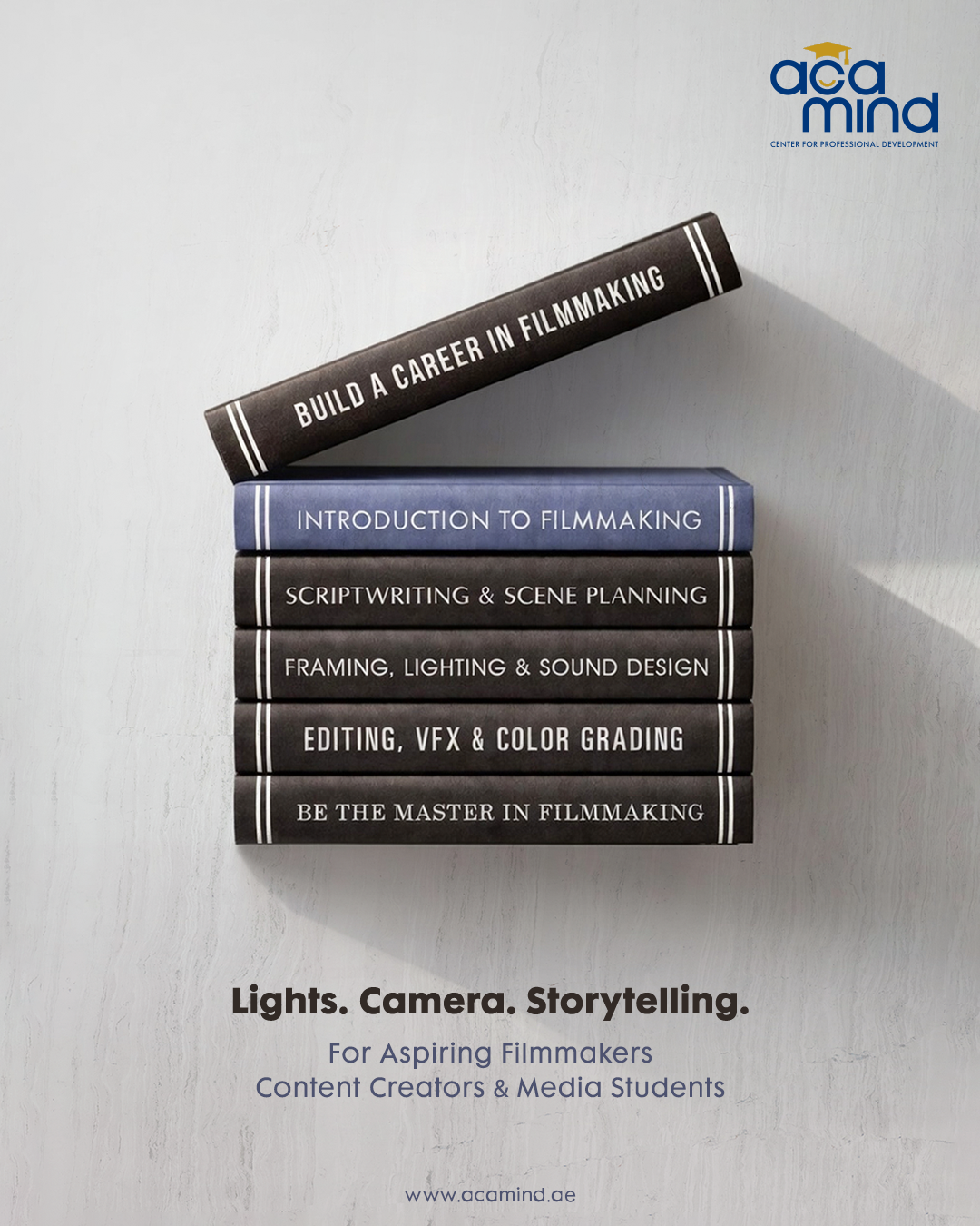 This professional campaign titled 'Clapper Board' was published in United Arab Emirates in March, 2026. It was created for the brand: Acamind Academy, by ad agency: Quick Fox Design. This Digital medium campaign is related to the Education industry and contains 1 media asset. It was submitted 11 minutes ago.