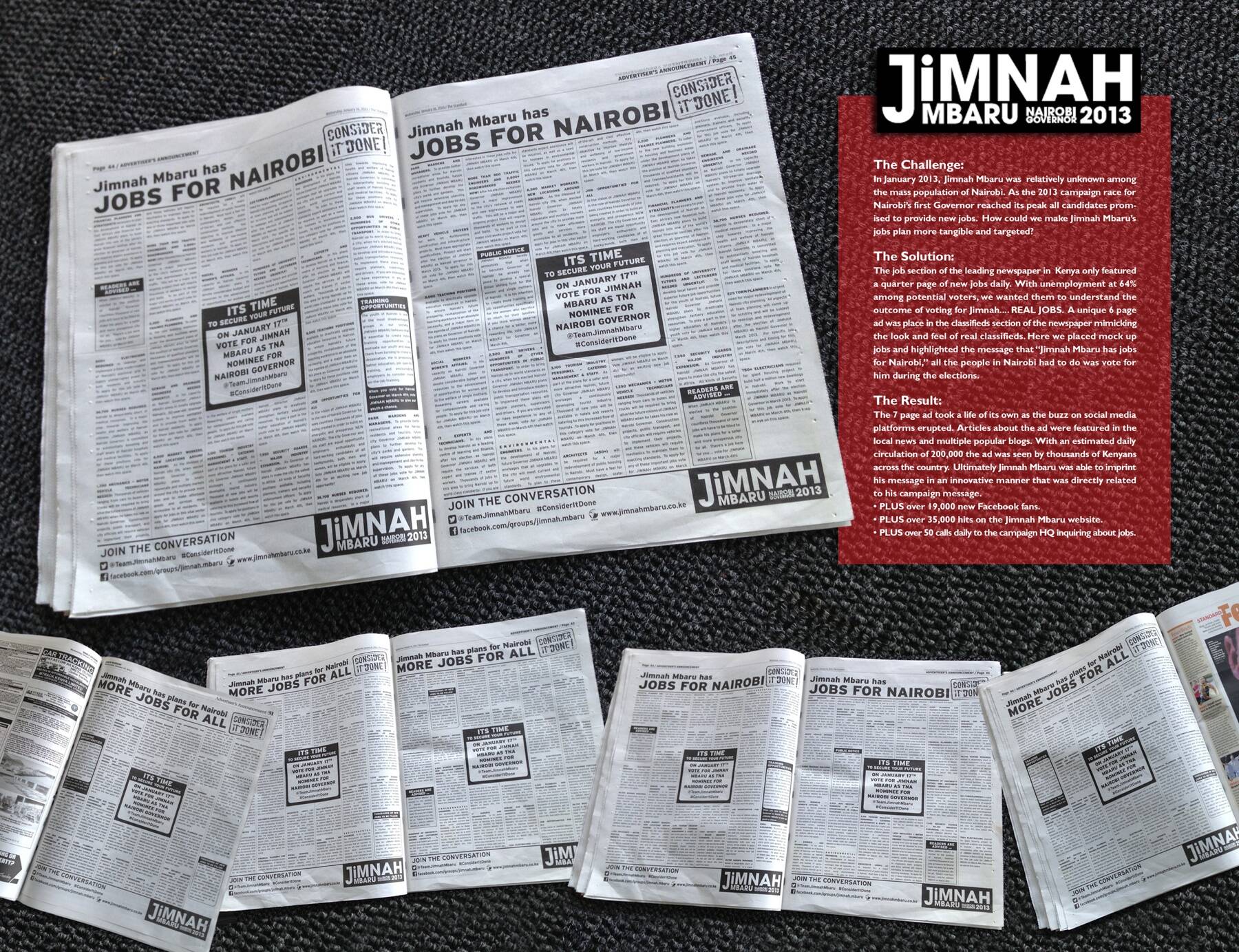 An election campaign in Kenya is a very big event, with months of politicking ahead of the actual election itself. We were approached by one of the key candidates in the race for the governorship of Nairobi to highlight his understanding and concern for the city’s unemployed. The creative approach was allied to an innovative media strategy. We took six full pages in the ‘job vacancy’ section of the city’s leading daily newspaper and filled them with dummy classifieds – all the jobs that the candidate promised to create if he was elected. This had an immediate effect on the electorate and press because this approach was totally new and unexpected. Press coverage and social media hits quickly went of the scale, and added enormous weight to the ad itself.
