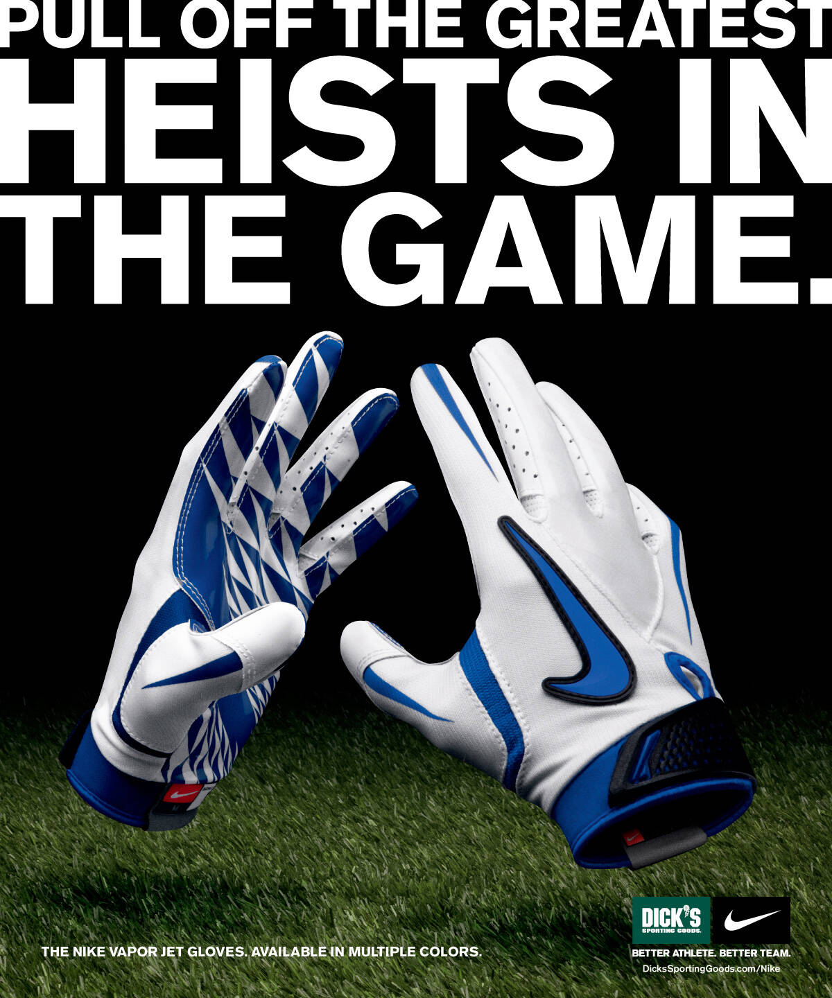This professional campaign titled 'Cleat, Gloves, Shorts' was published in United States in September, 2010. It was created for the brands: Dick's and Nike, by ad agency: Wieden + Kennedy. This Print medium campaign is related to the Fashion industry and contains 3 media assets. It was submitted about 15 years ago.