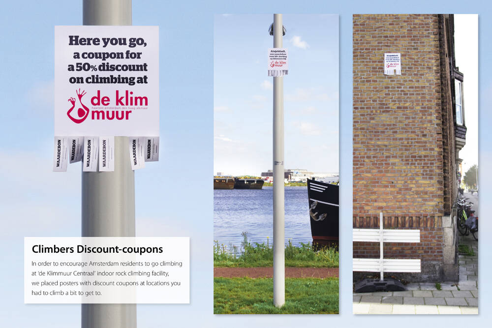 This professional campaign titled 'Climbers discount coupons' was published in The Netherlands in October, 2011. It was created for the brand: Klimmuur Centraal, by ad agency: N=5. This OOH Outdoor medium campaign is related to the Recreation, Leisure industry and contains 1 media asset. It was submitted about 14 years ago.