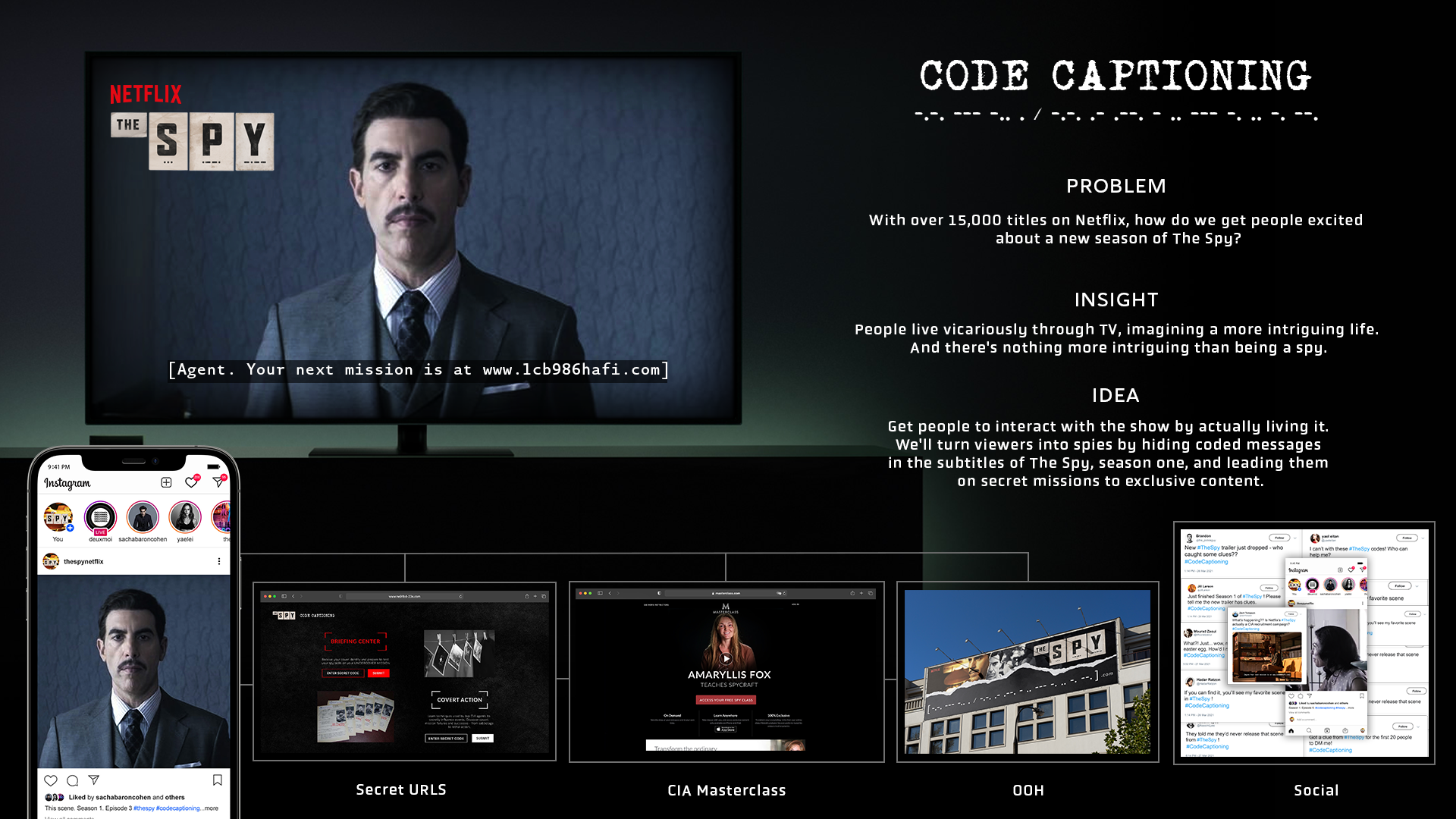 Netflix needed to get people excited about the new season of The Spy. Instead of just asking people to watch the show, we got them to live it. Using coded messages in subtitles, OOH, social, and even radio, we sent people on missions to interact with the show like never before. To become spies themselves.
