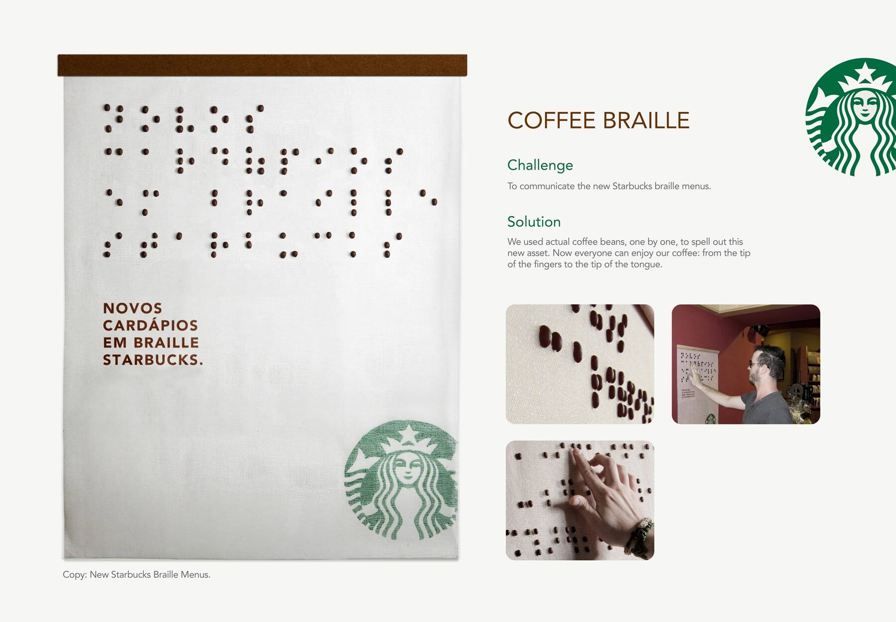 This professional campaign titled 'Coffee Braille' was published in Brazil in March, 2013. It was created for the brand: Starbucks, by ad agency: Rai. This Ambient medium campaign is related to the Drinks (Non Alcoholic) industry and contains 1 media asset. It was submitted over 12 years ago.
