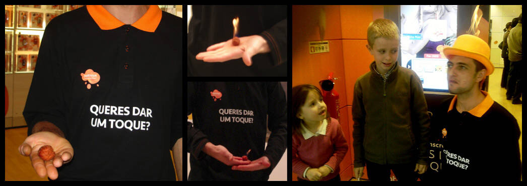 In order to advertise LG Cookie, that is an affordable cellphone with touchscreen technology, a guerrilla stunt was created with the concept "You can touch it". Performers went to Optimus stores and invited people to touch flaming balls in their hands. The secret here was that they used cold fire, which can be touched without danger.