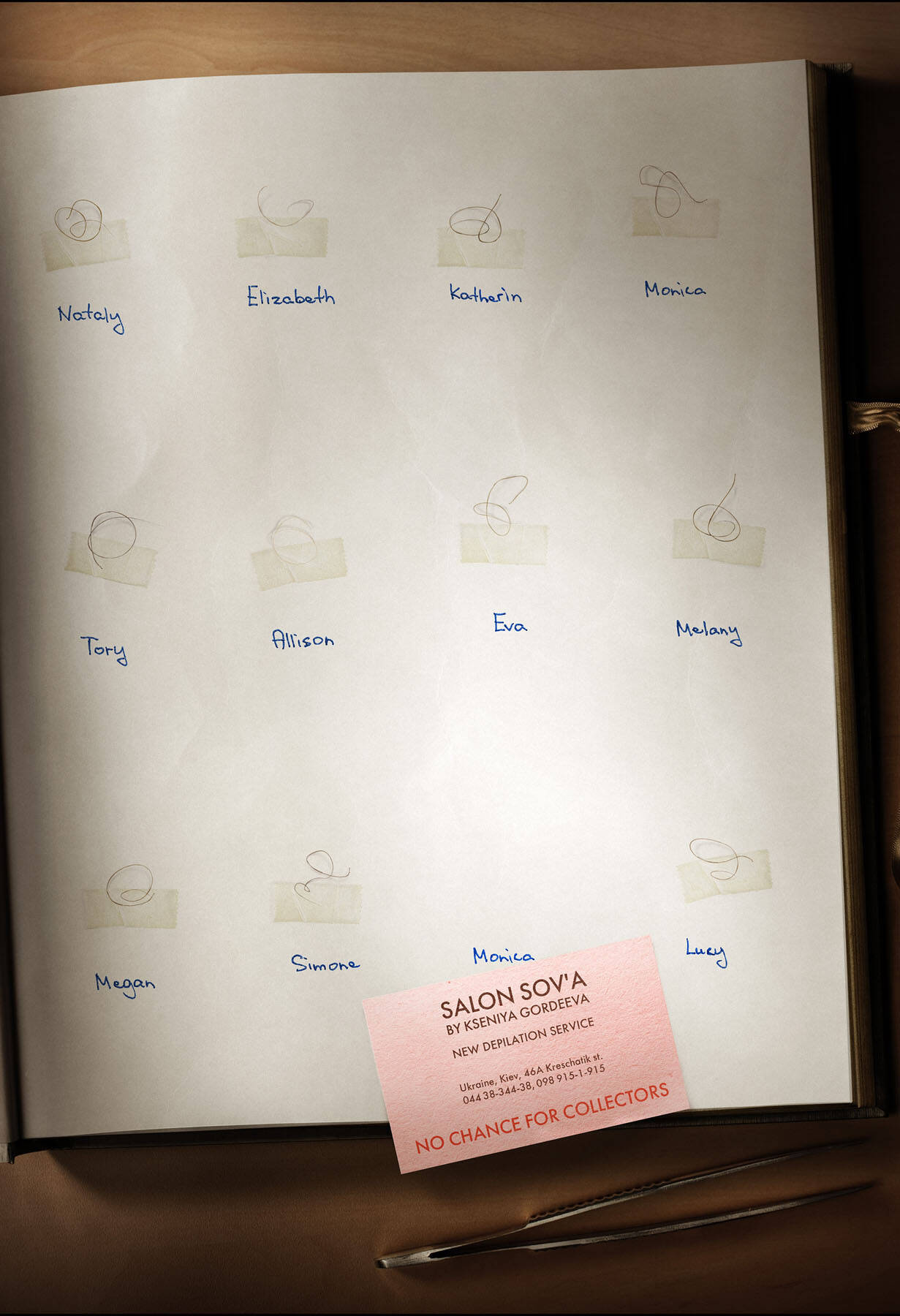 This professional campaign titled 'Collector' was published in Ukraine in December, 2012. It was created for the brand: Salon Sov'a, by ad agency: Michurin. This Print medium campaign is related to the Professional Services industry and contains 1 media asset. It was submitted almost 13 years ago.