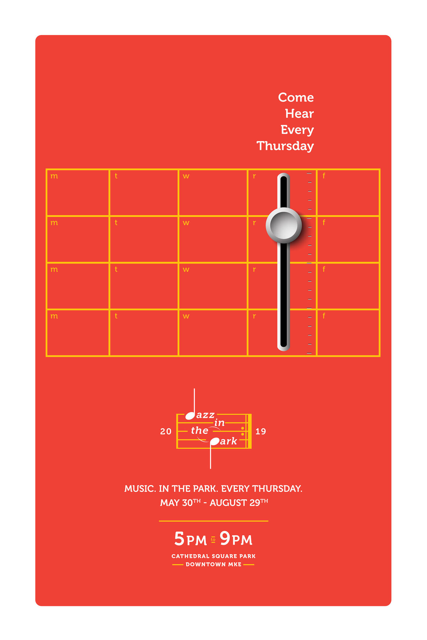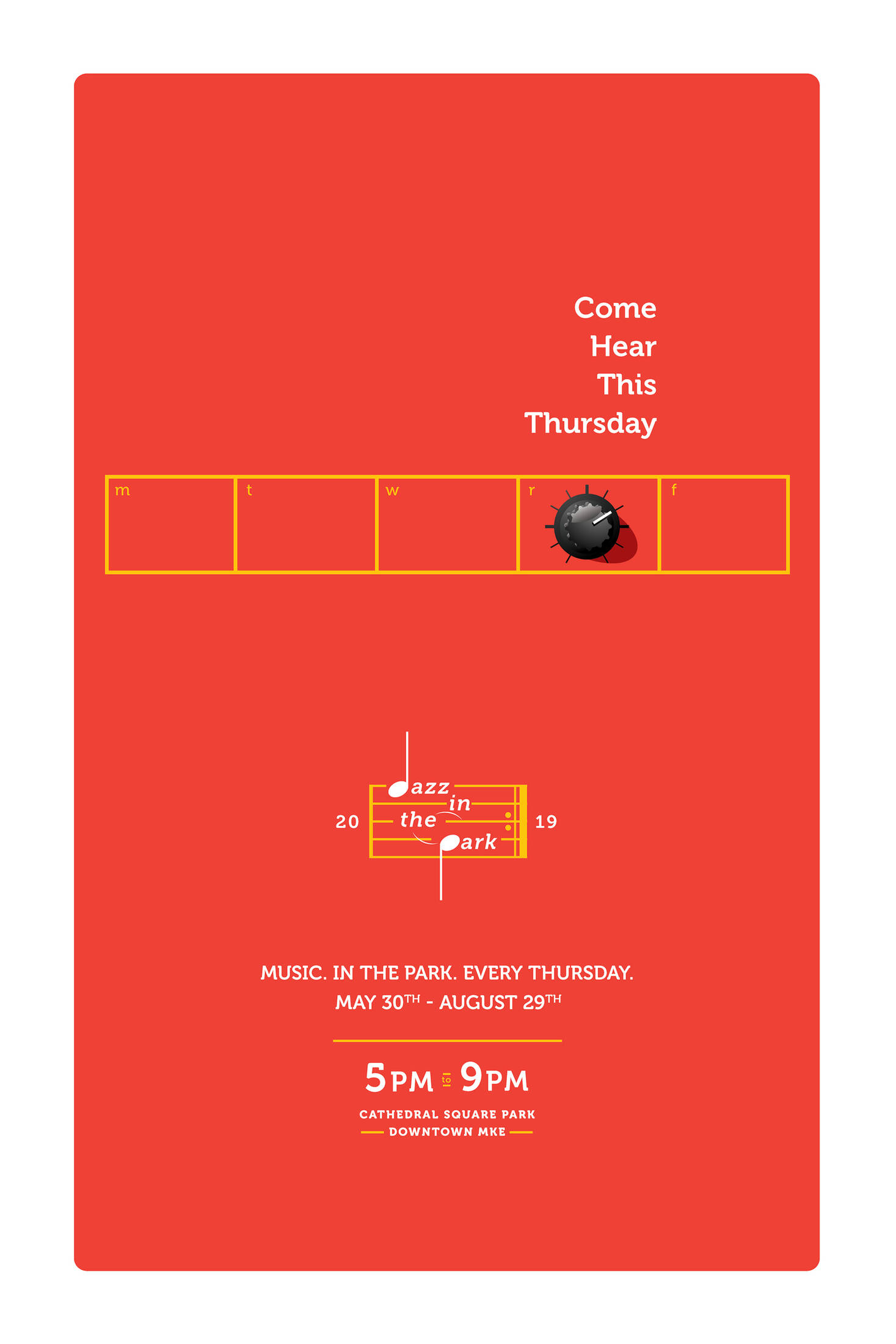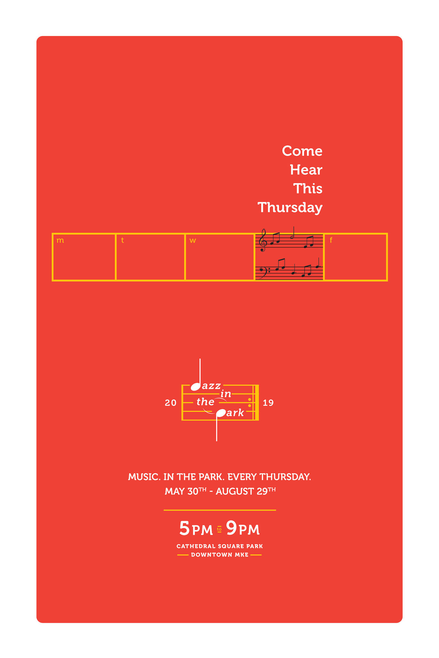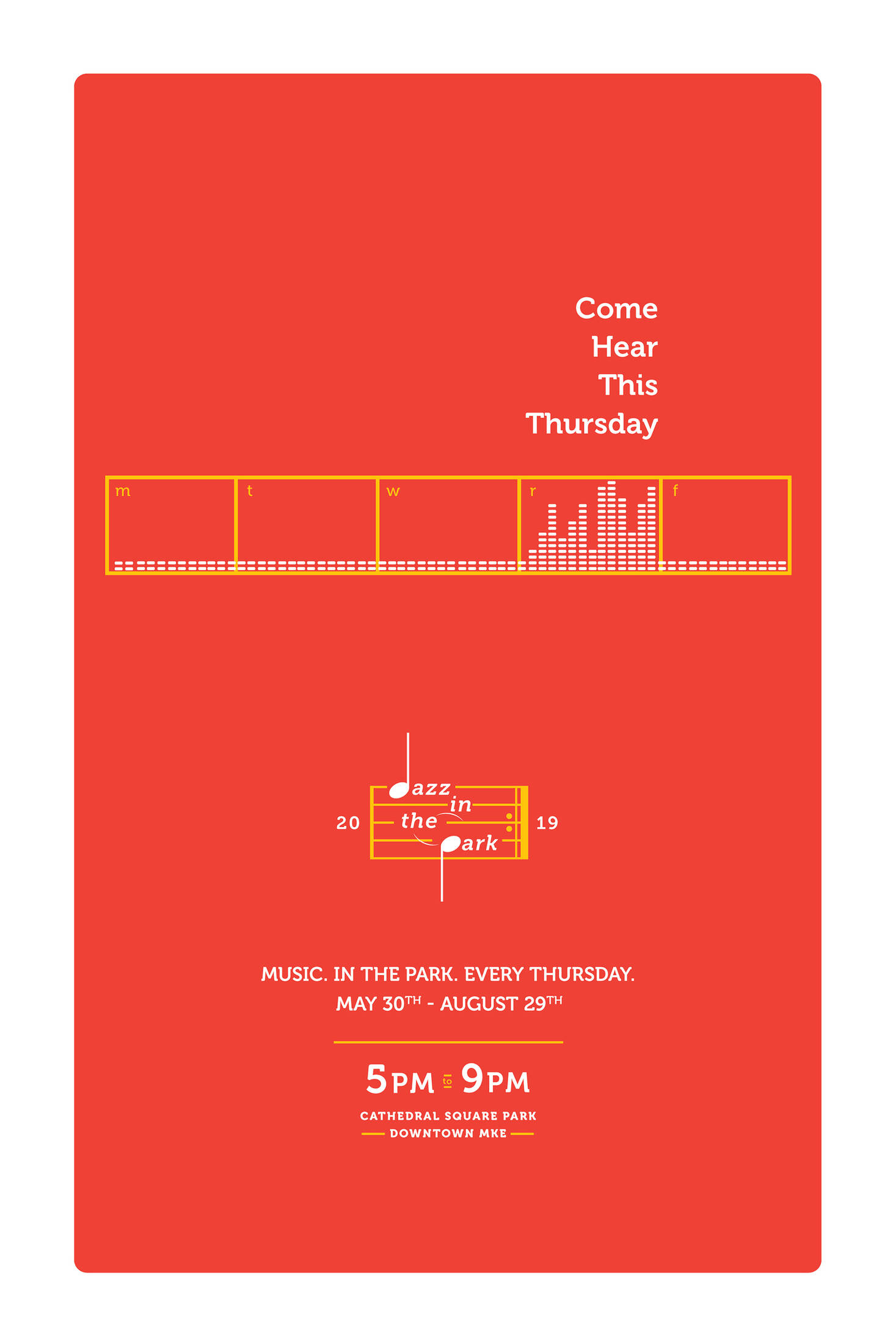 Jazz in the Park is a free, local festival in the heart of downtown Milwaukee that runs for several months in the summer time. In order to keep this event top of mind, we created simple posters to remind them of what they can do on Thursdays, during the summer.