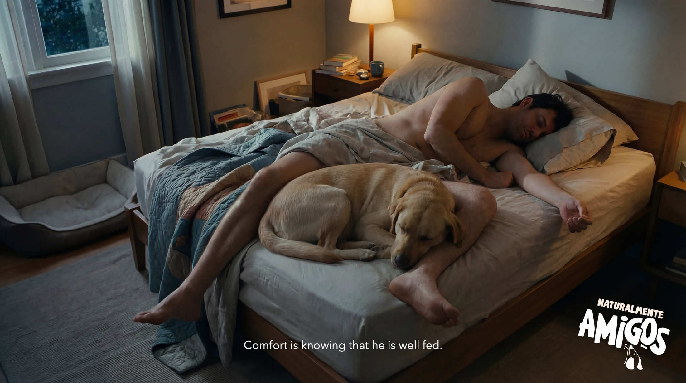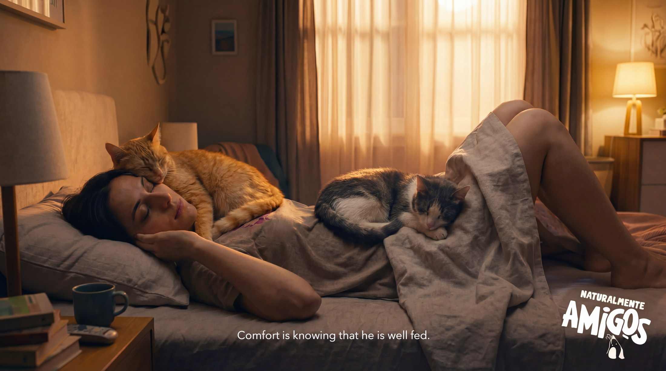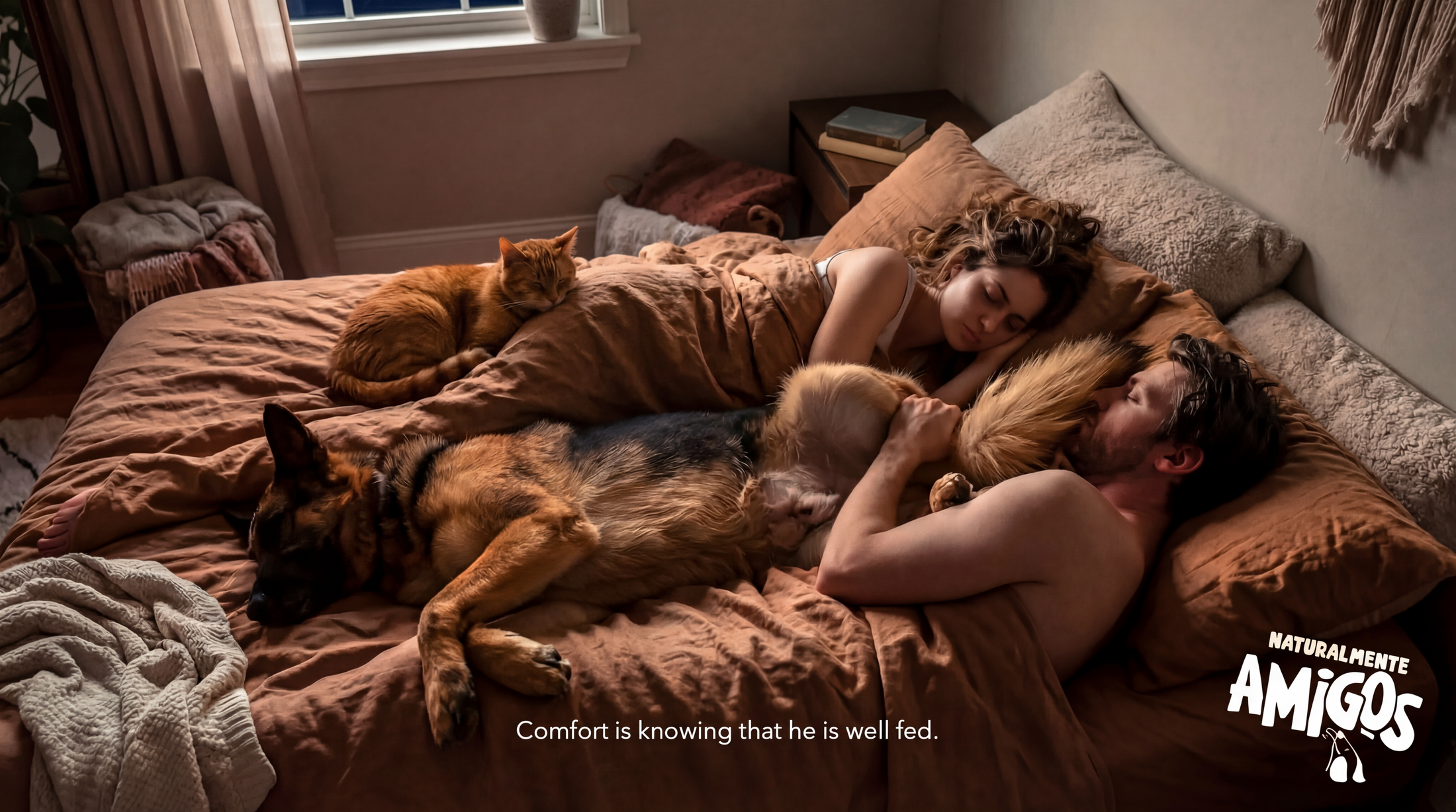 The brand needed to strengthen its communication by talking about how important it is for people to know that their pets are well fed. We found a strong insight: many pets sleep in their owners’ beds, and owners avoid moving them or waking them up. Instead, they prefer to adjust themselves in any way just to keep their pets comfortable. Based on this idea, we created a campaign through a series of ads designed with AI called: “Comfort is knowing that he is well fed.”