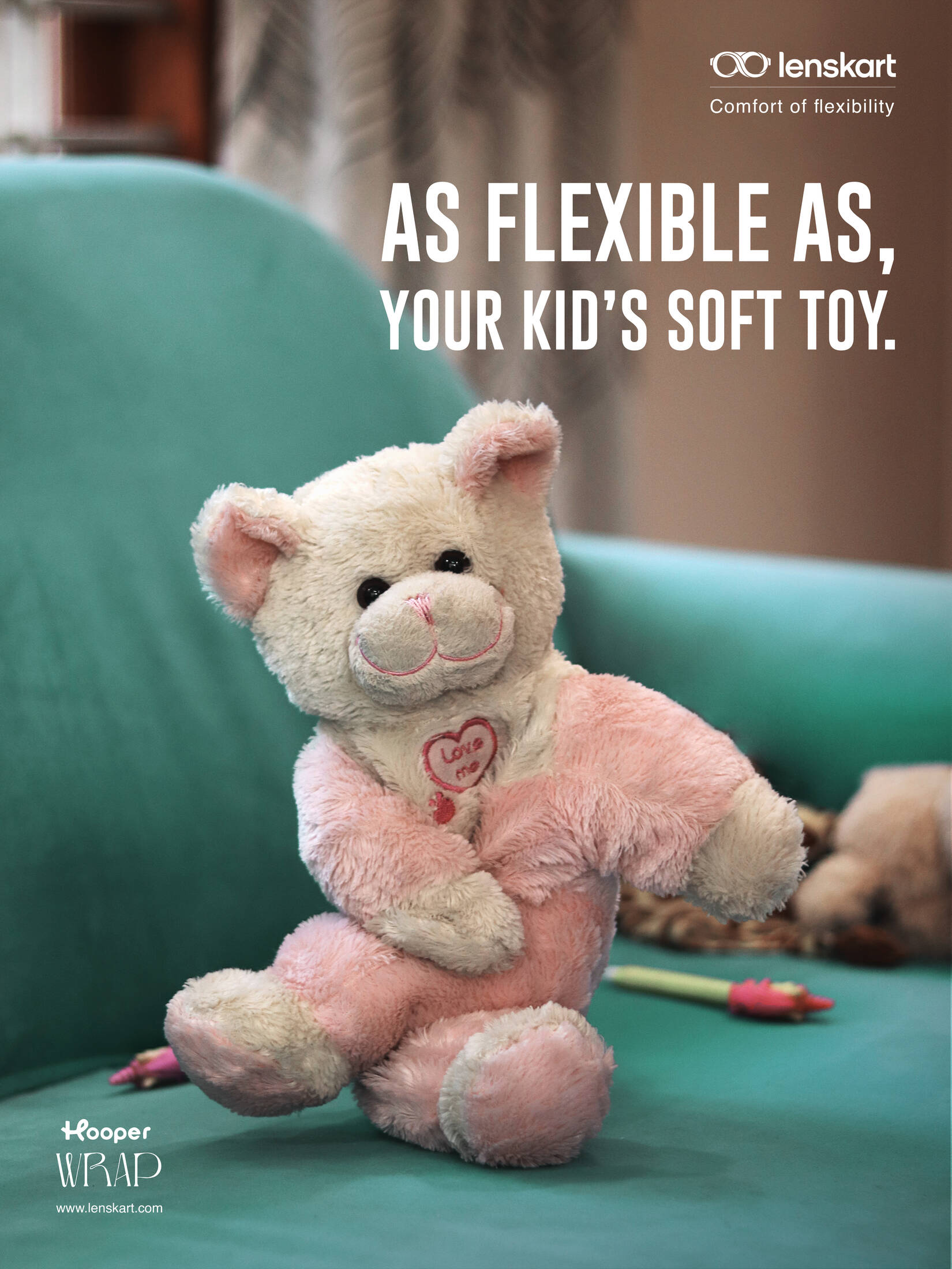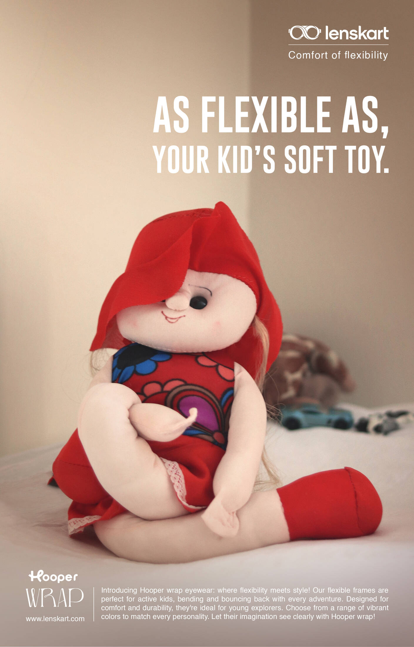 The presented print ad for Lenskart's "Hooper Wrap" depicts comfort and flexibility. It's an attempt to communicate the features of these eye frames that are adaptable and flexible just like the soft toys of your children. These glasses return to their initial form regardless of how you use them, so say goodbye to the worry of damaged eyeglasses and hello to boundless adventures with Lenskart Hooper. Explore the flexibility & discover eyewear that resonates with the comfort of your children while embracing the essence of young creativity.