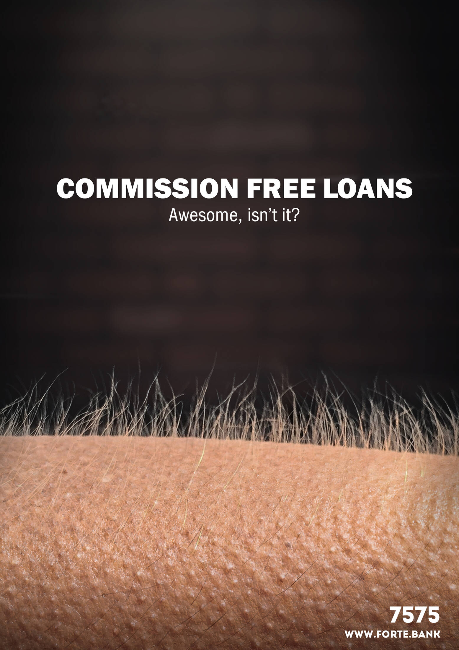 This professional campaign titled 'Commission Free Loans' was published in Kazakhstan in March, 2018. It was created for the brand: ForteBank, by ad agency: Kombinat. This Print medium campaign is related to the Finance industry and contains 1 media asset. It was submitted over 7 years ago.