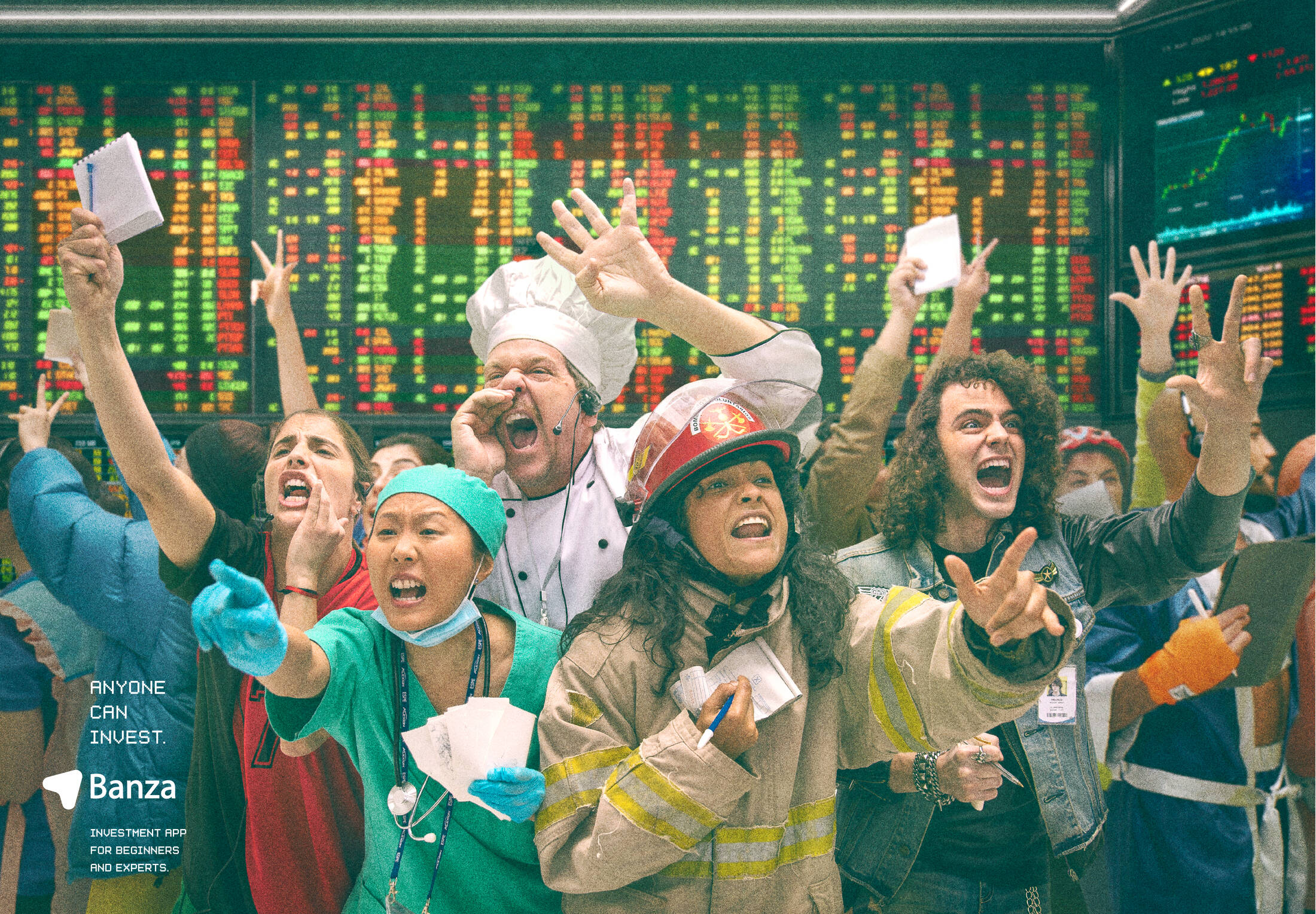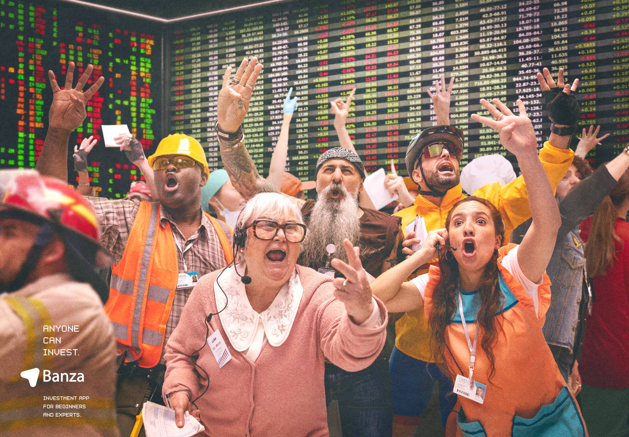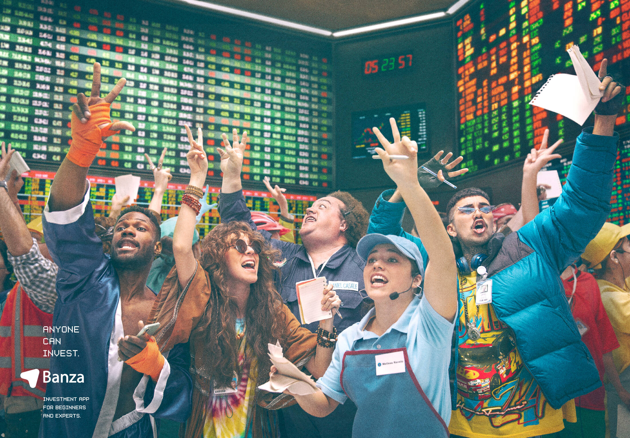 Using a bit of humor, the campaign makes investing feel more attainable with the help of Banza. We used imagery that you’re used to seeing when you think about the stock market and then added characters who you typically wouldn’t imagine there