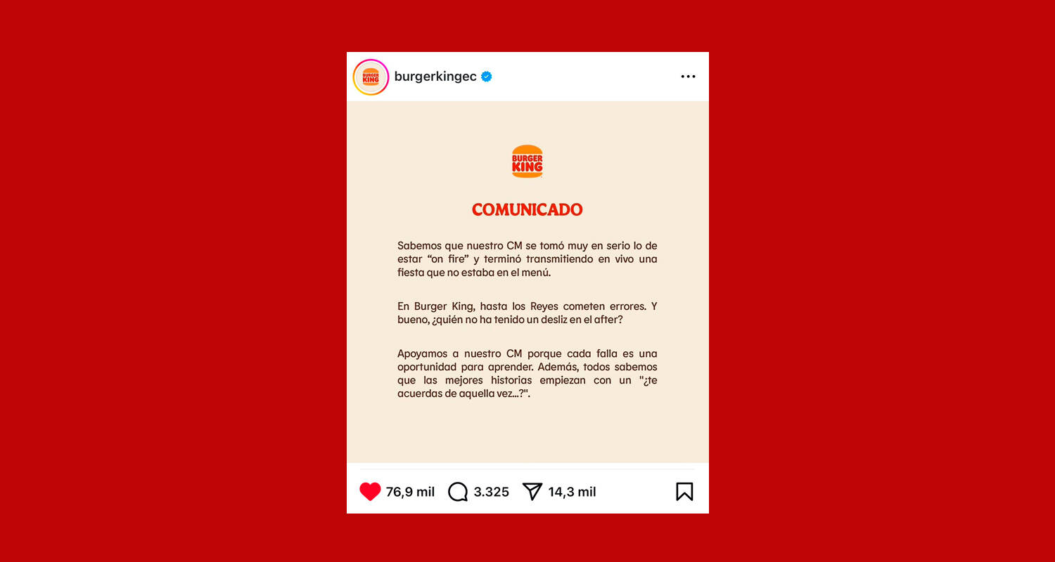 The recent "mistake" by Burger King Ecuador's Community Manager, who "accidentally" livestreamed a private party from the brand’s official account, quickly went viral and captured the attention of the public and other brands. With the guidance of BBA Ecuador, Burger King responded not with a formal apology but with a humorous and relaxed statement that read, "Even kings make mistakes." This witty response sparked supportive and humorous reactions from other brands on social media, transforming a potential mishap into a memorable moment of connection. By addressing the situation with humor and transparency, Burger King, along with BBA Ecuador, not only managed any potential negative impact but also strengthened its bond with followers, who appreciated the brand’s authenticity.