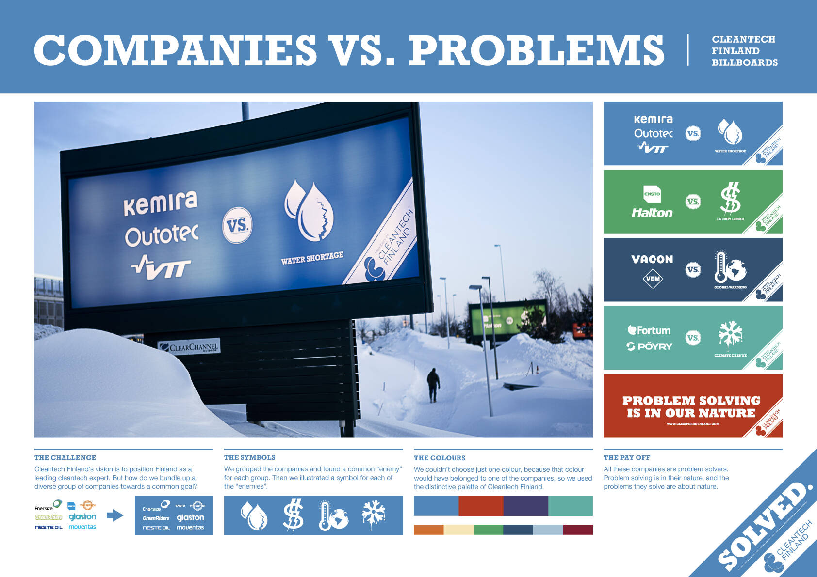 This professional campaign titled 'Companies vs. Problems' was published in Finland in May, 2012. It was created for the brand: Cleantech, by ad agency: 358. This OOH Outdoor medium campaign is related to the Industrial industry and contains 1 media asset. It was submitted over 13 years ago.