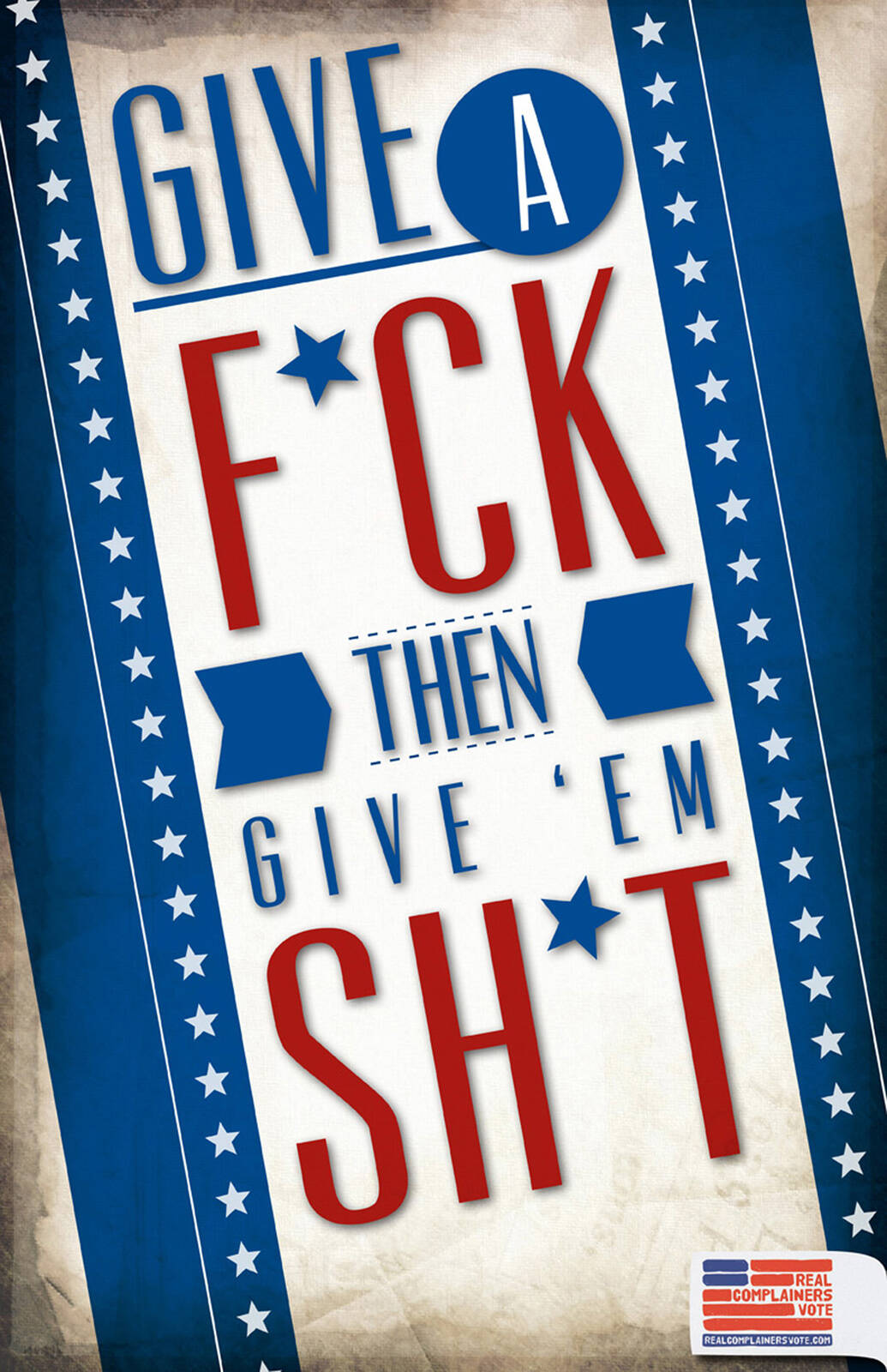 This professional campaign titled 'Complaining is the second most patriotic thing you can do...' was published in United States in October, 2012. It was created for the brand: Real Complainers Vote, by ad agency: Third Street. This OOH Outdoor medium campaign is related to the Public Interest industry and contains 7 media assets. It was submitted about 13 years ago.
