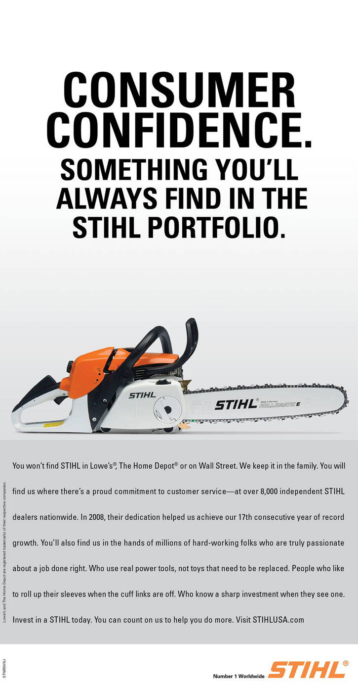 This professional campaign titled 'Confidence' was published in United States in October, 2008. It was created for the brand: Stihl, by ad agency: Winsper. This Print medium campaign is related to the House, Garden industry and contains 1 media asset. It was submitted about 17 years ago.