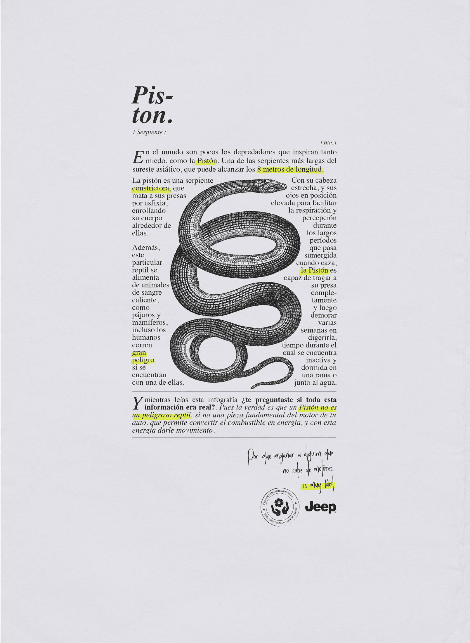 Some parts inside our cars have complicated names, especially in our engines. Camshaft, crankshafts, piston, springs, you name it. And in Spanish, some of those words relate and sound very, but very similar to other things in nature. That’s why we create this campaign, exploring how easy is to make mistakes with stuff in our engines, if you don’t know much about engines. So better leave it to professionals and always choose Jeep’s authorized services.