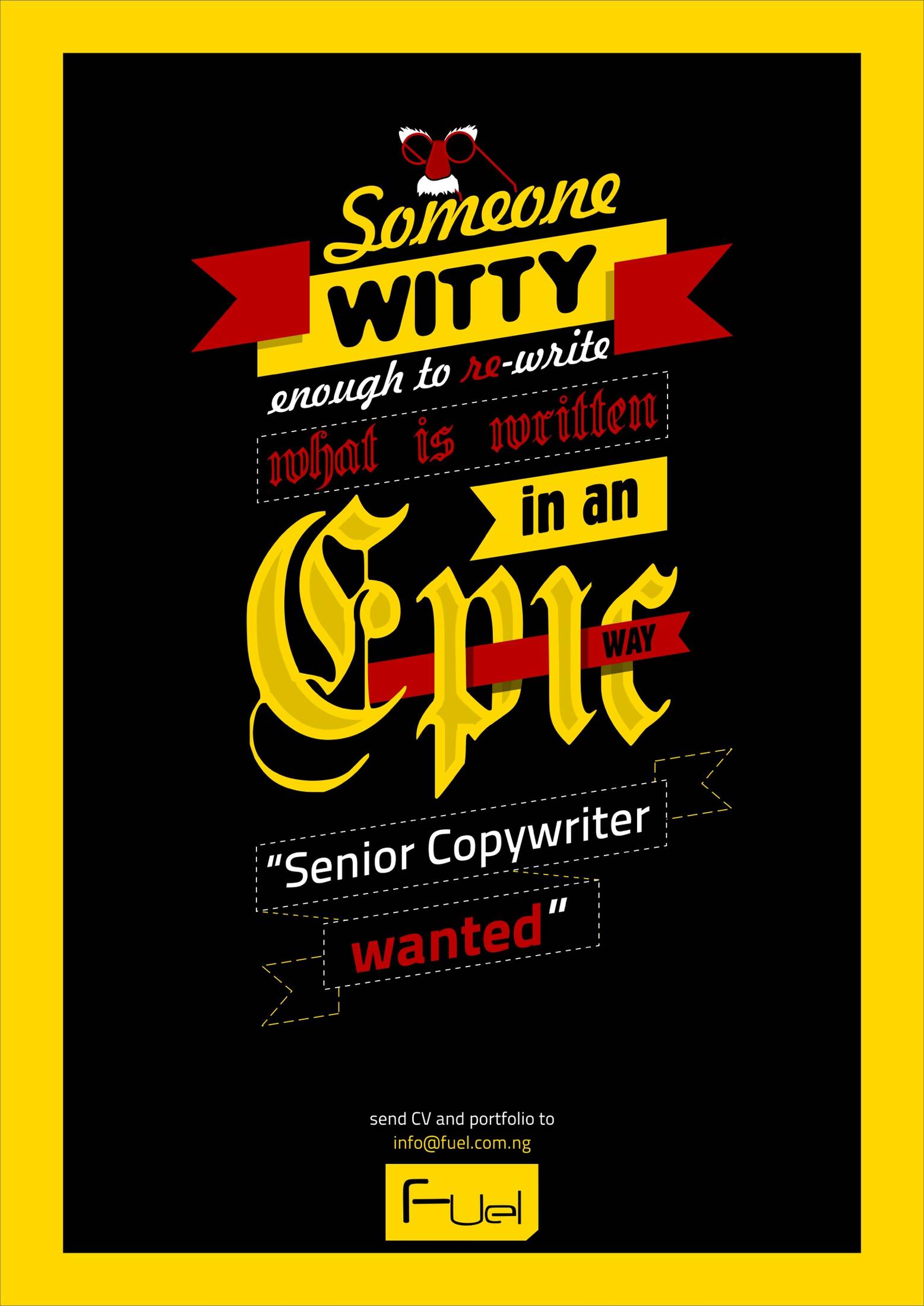 This professional campaign titled 'Copywriter wanted' was published in Nigeria in September, 2014. It was created for the brand: Fuel Communications, by ad agency: Fuel. This Print medium campaign is related to the Agency Self-Promo industry and contains 2 media assets. It was submitted about 11 years ago.