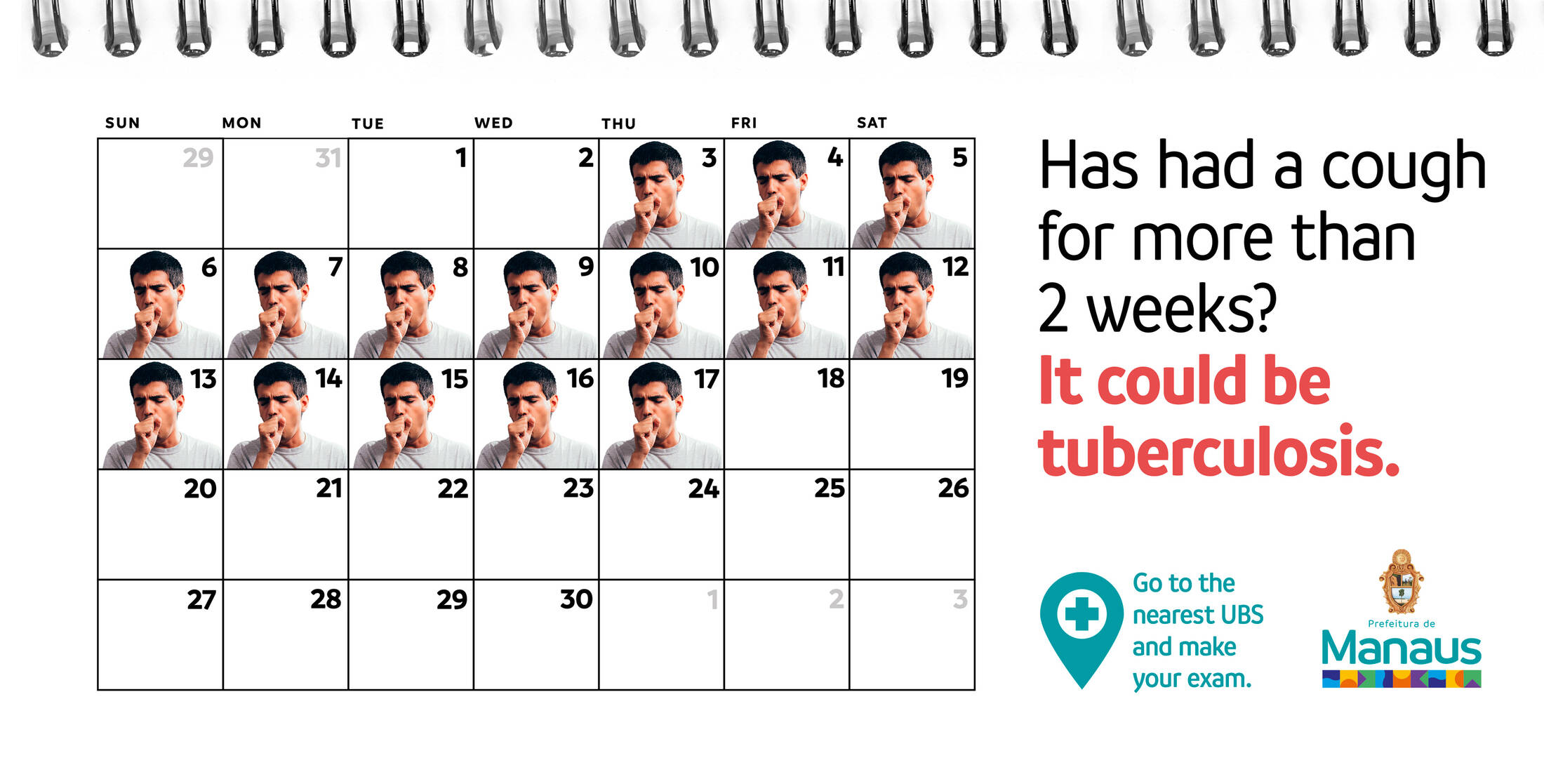 This professional campaign titled ' Cough for more than 2 weeks could be tuberculosis.' was published in Brazil in March, 2023. It was created for the brand: Prefeitura de Manaus, by ad agency: Mene & Portella. This OOH Outdoor and Print media campaign is related to the Health and Public Utility industries and contains 3 media assets. It was submitted over 2 years ago.
