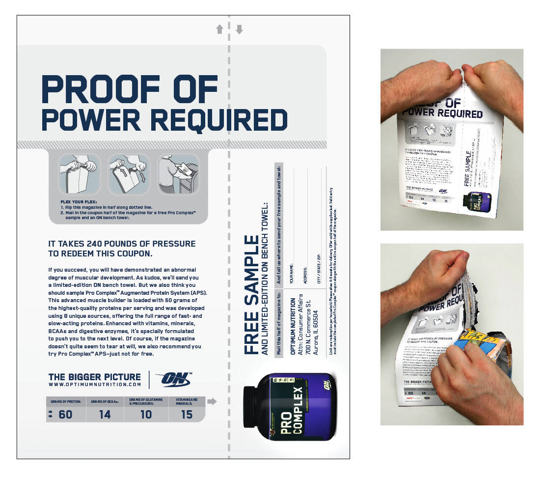 Back Cover Ad: In order to redeem the coupon for a free sample of Pro Complex (an advanced Protein Powder), bodybuilders, as a test of strength, had to rip the entire magazine in half (as opposed to cutting it out with scissors) and mail the spine in to Optimum Nutrition.
