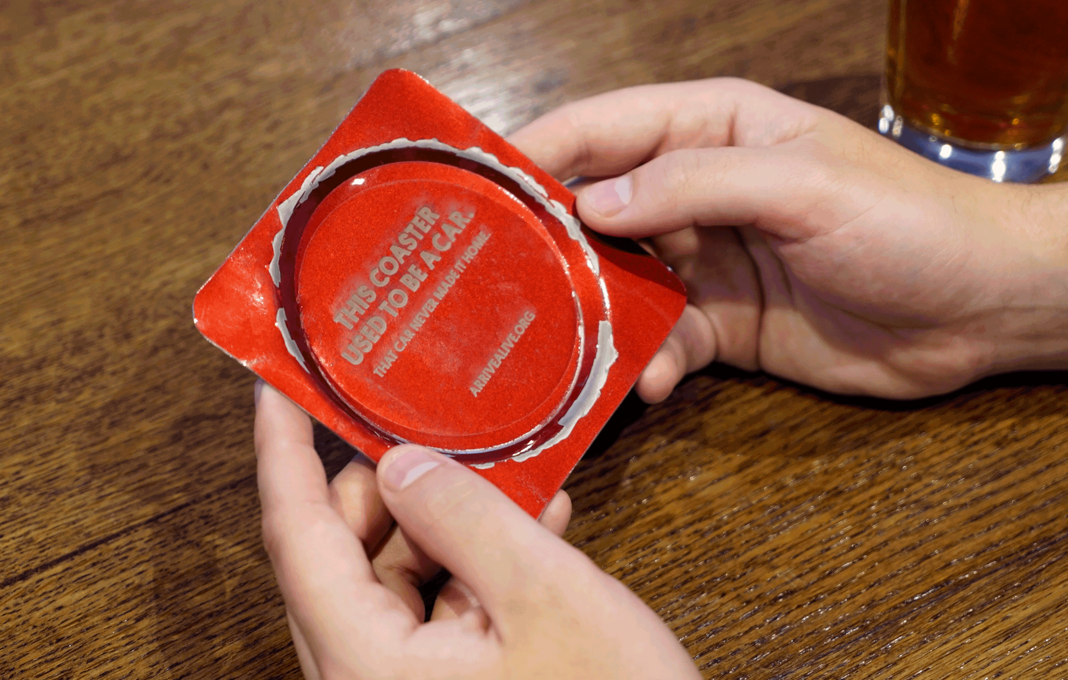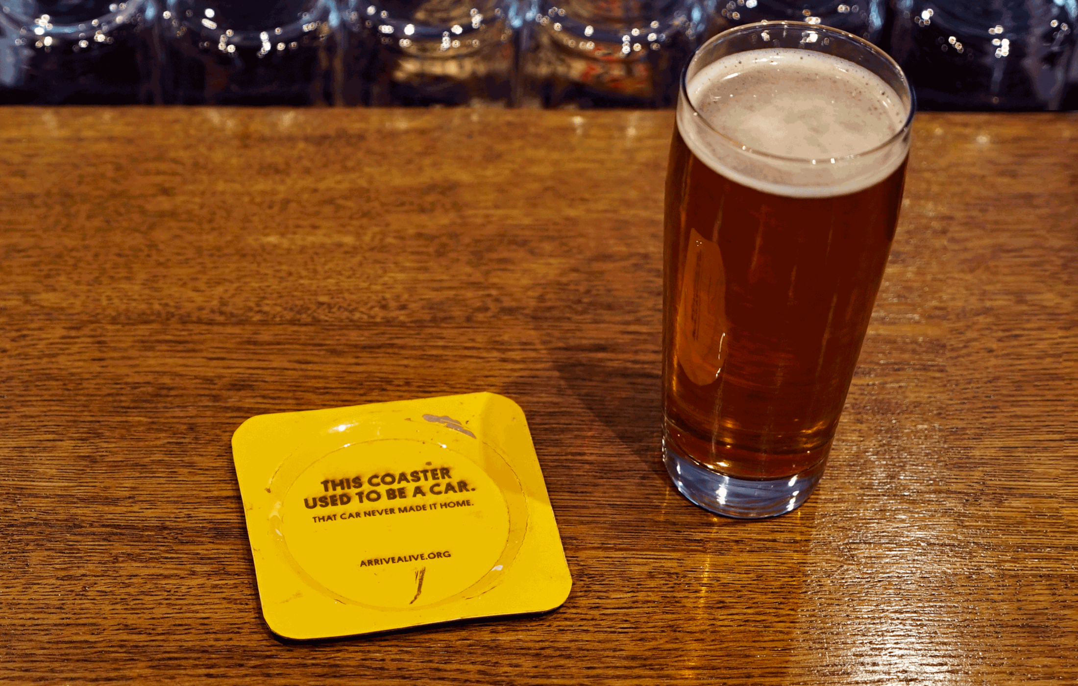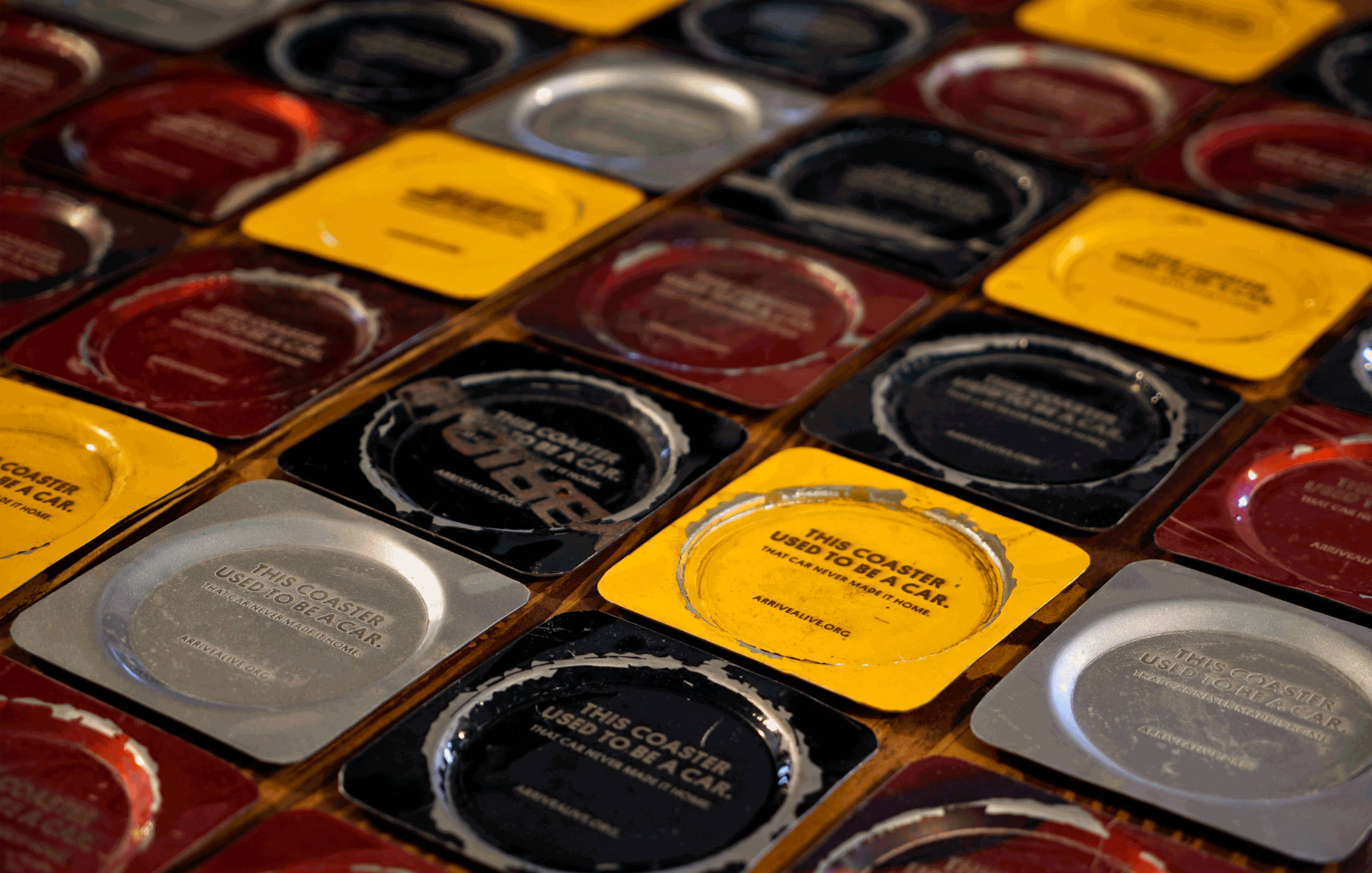 On St. Patrick's Day, Arrive Alive and The Emmet Ray bar served coasters made from car wrecks to partiers as a sobering reminder to not drink and drive. On the coasters were laser-etched messages.