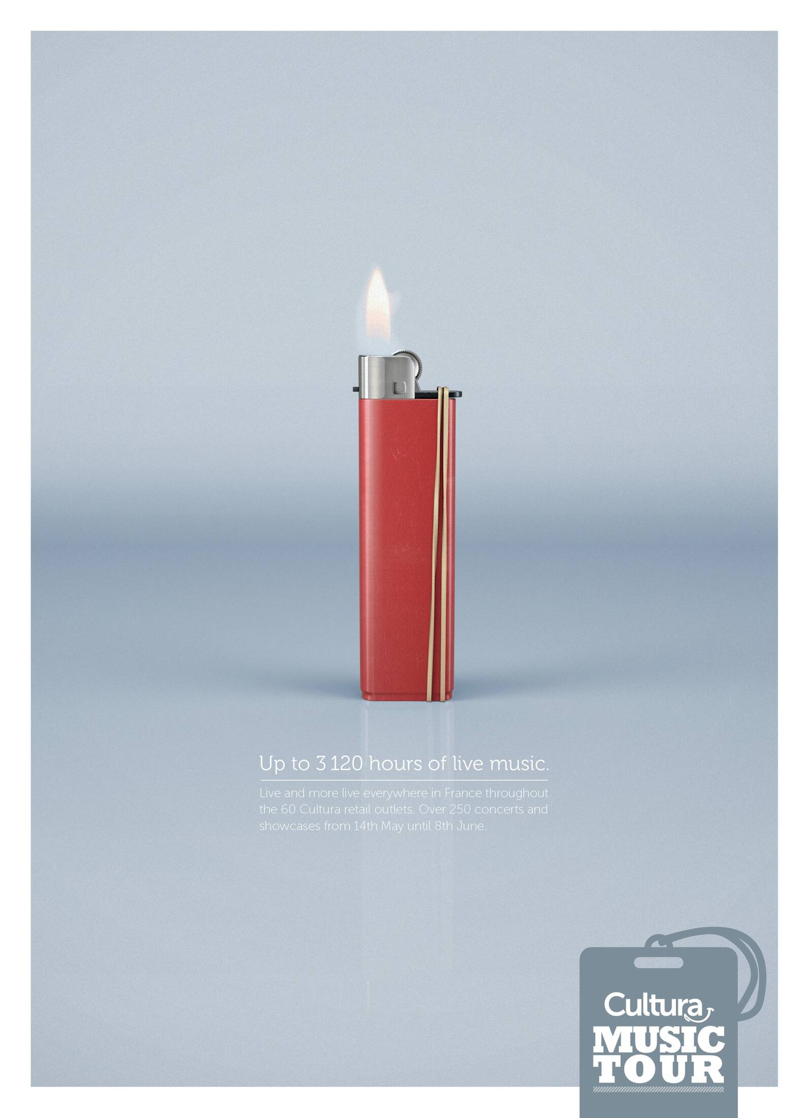 This professional campaign titled 'Cultura Music Tour' was published in France in May, 2014. It was created for the brand: Cultura, by ad agency: St John's. This Print medium campaign is related to the Retail Services industry and contains 1 media asset. It was submitted over 11 years ago.