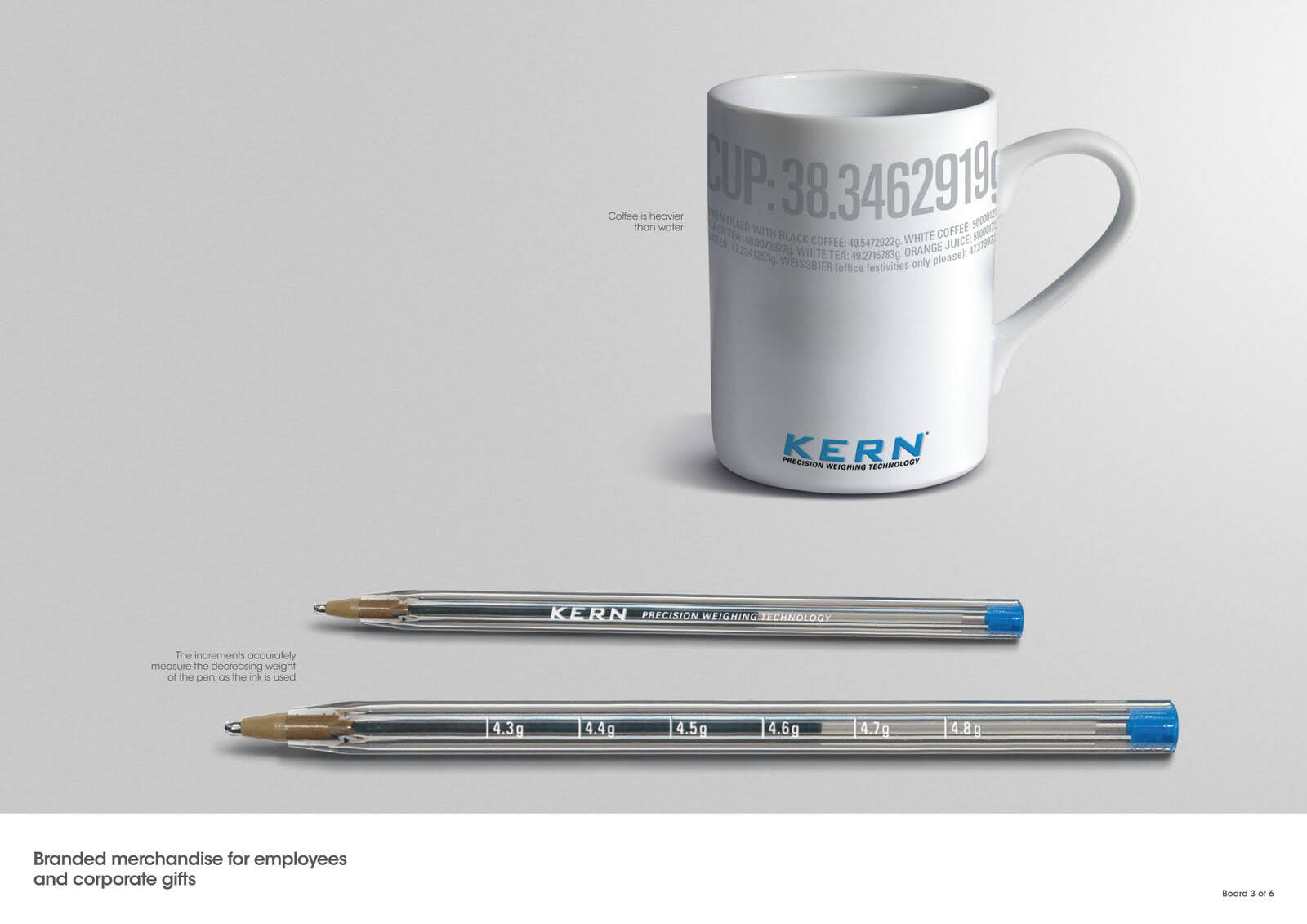 To advertise Kern's exceptional Precision Scales, we created some corporate merchandise: a pen that tells you its own descending weight, as you use it. And a cup that tells you - to 7 decimal places - how much it weighs when exactly filled with different drinks weigh - coffee, tea, water and even German Weissbier (office parties only). All measurements conducted by Kern scientists in laboratory conditions.