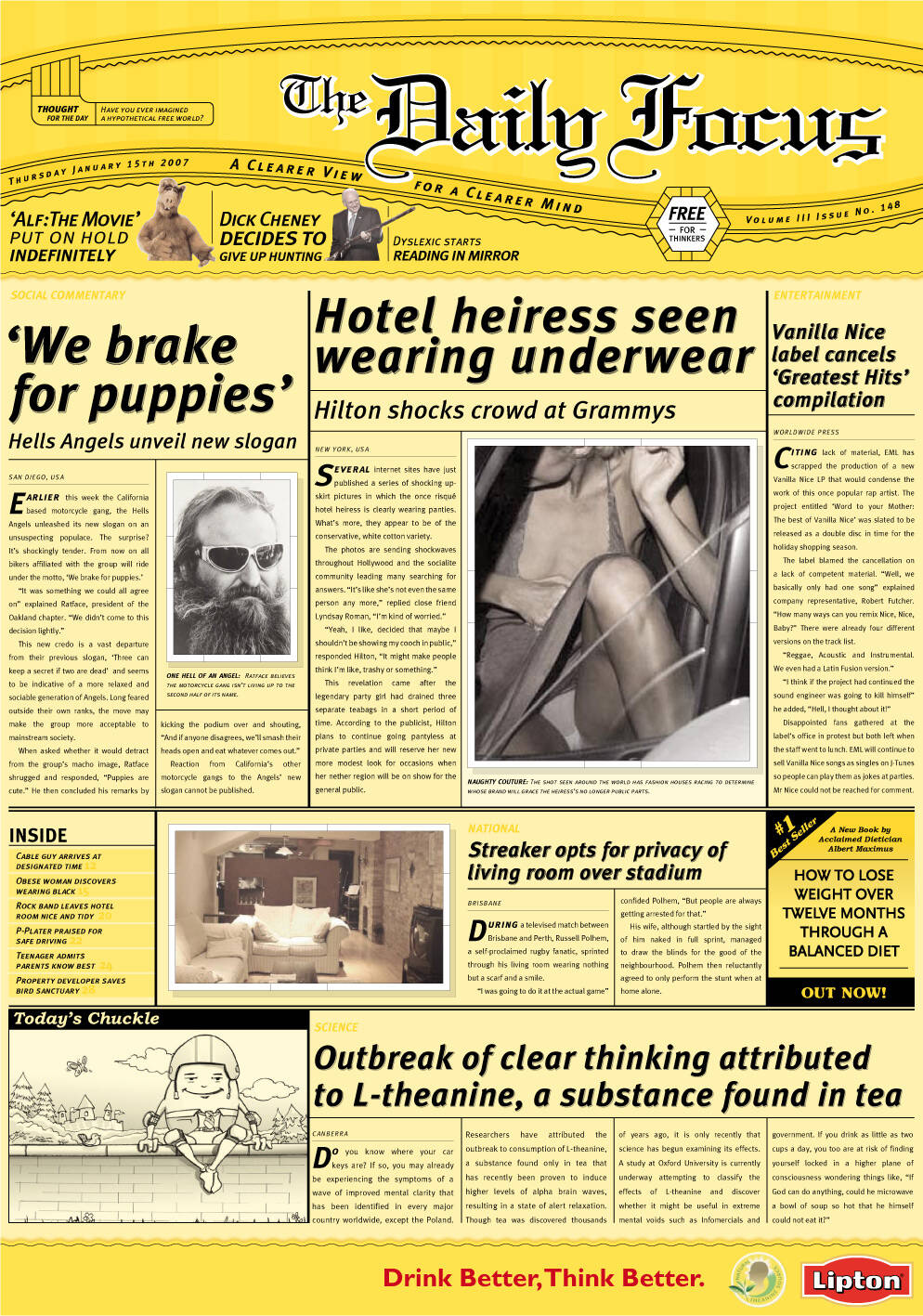 This NSFW professional campaign titled 'Daily Focus, Hilton' was published on September 18, 2007. This Print medium campaign is related to the Drinks (Non Alcoholic) industry and contains 1 media asset. It was submitted about 18 years ago.