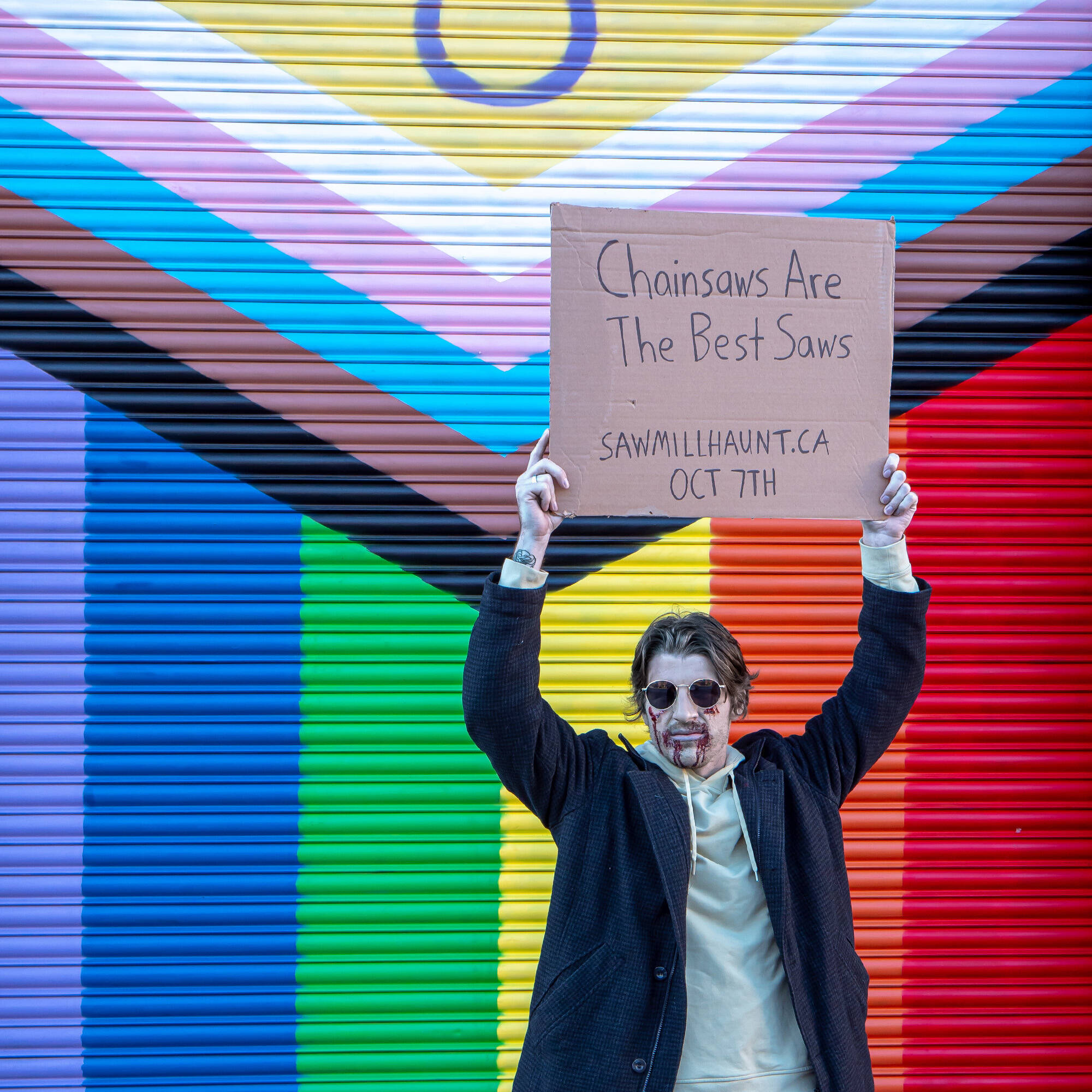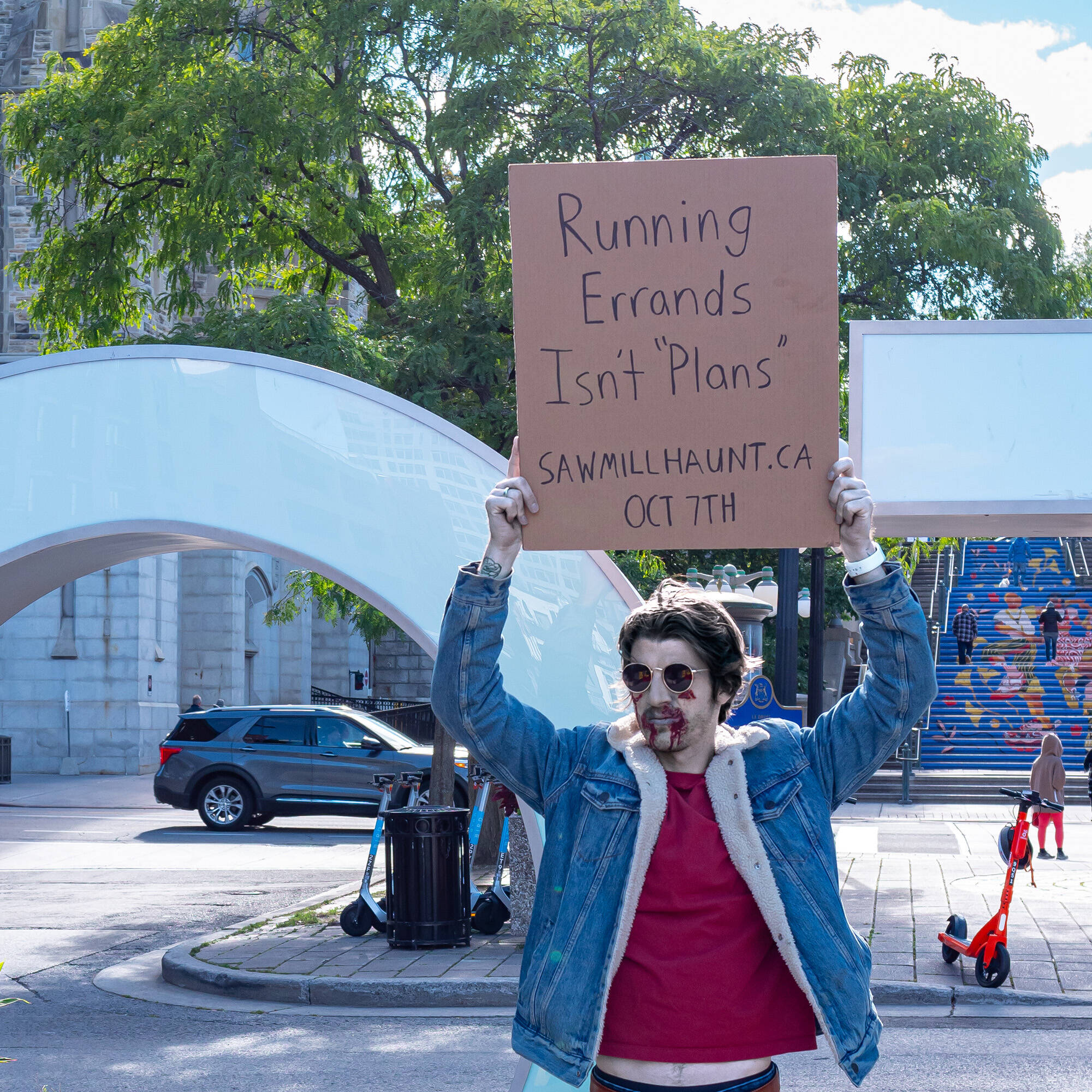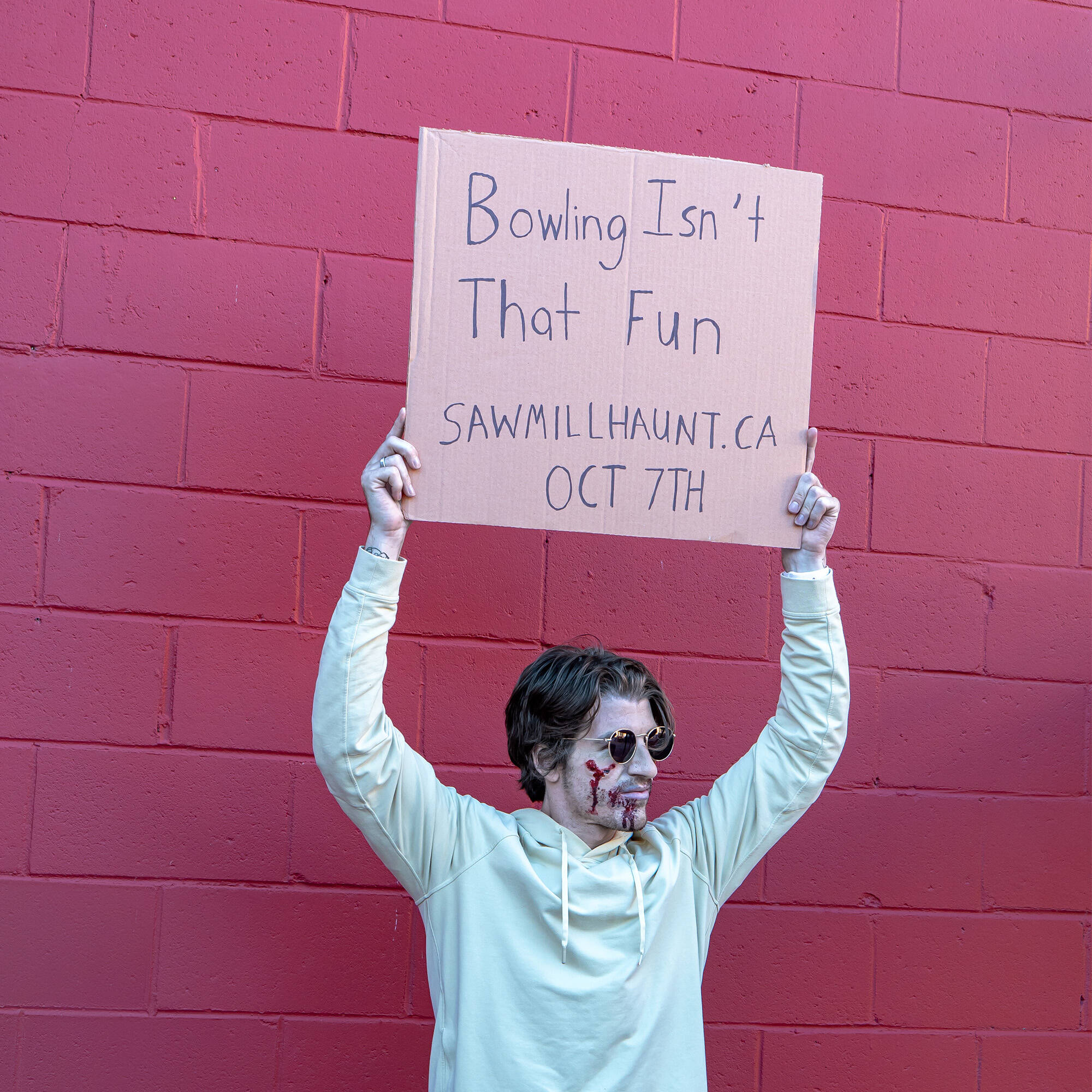 We wanted to get "Dude With Sign" to help us promote The Sawmill Haunt this year, but he wasn’t answering our calls. So we created our own influencer "Dead With Sign" to encourage people to get out of the house and do something fun this fall.