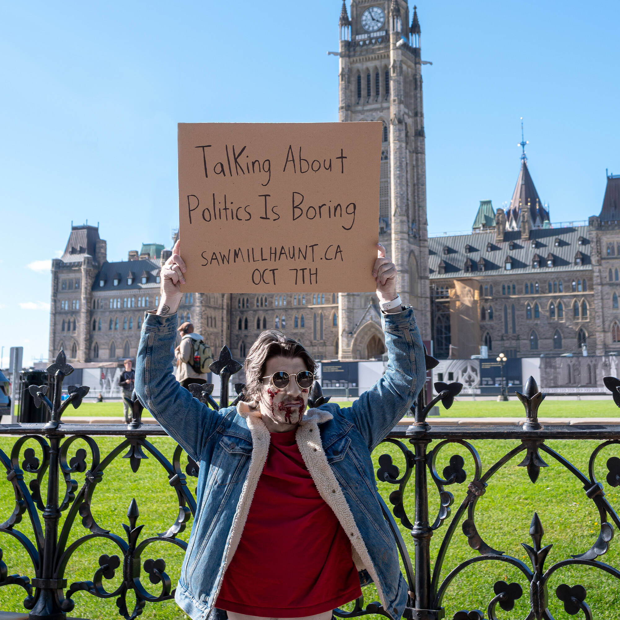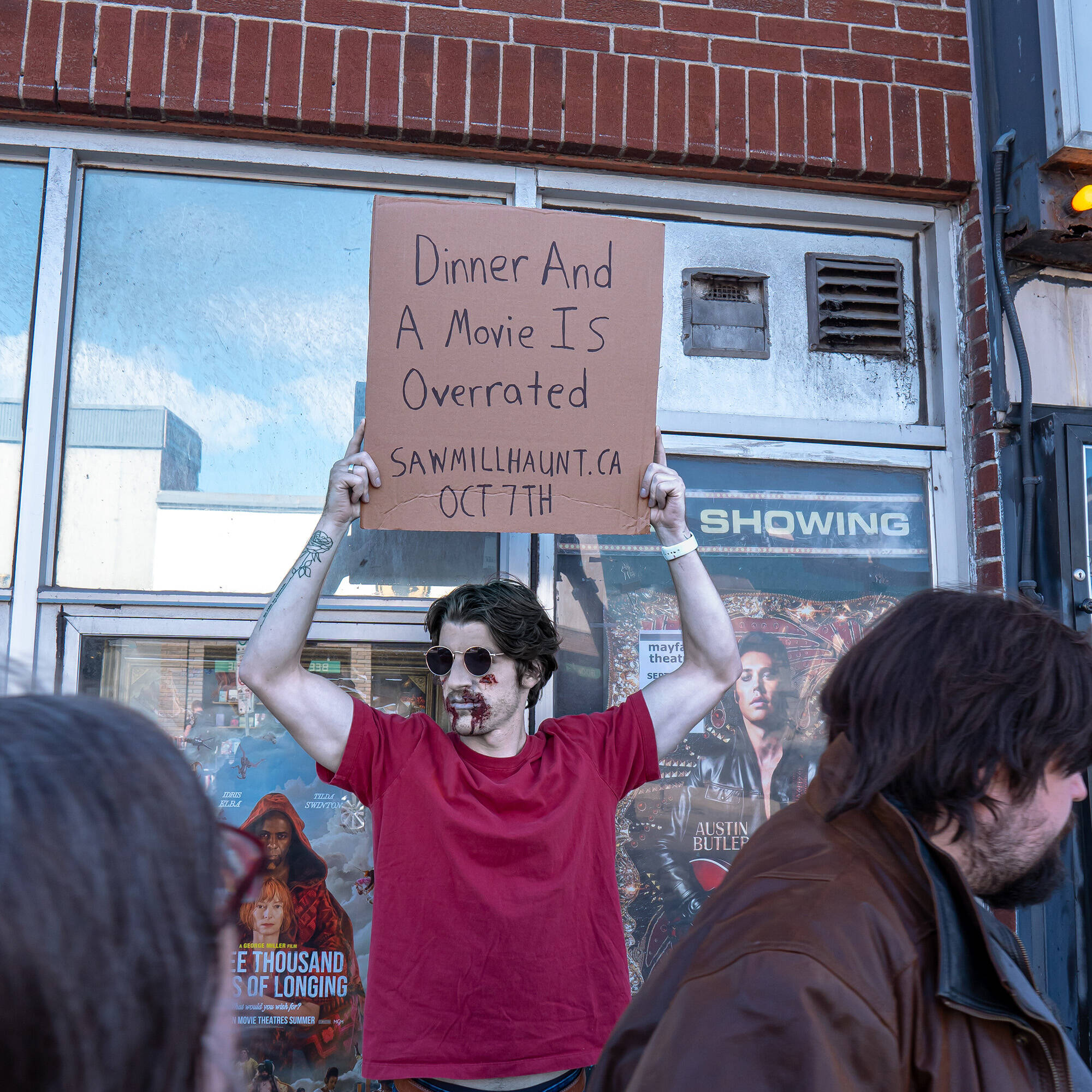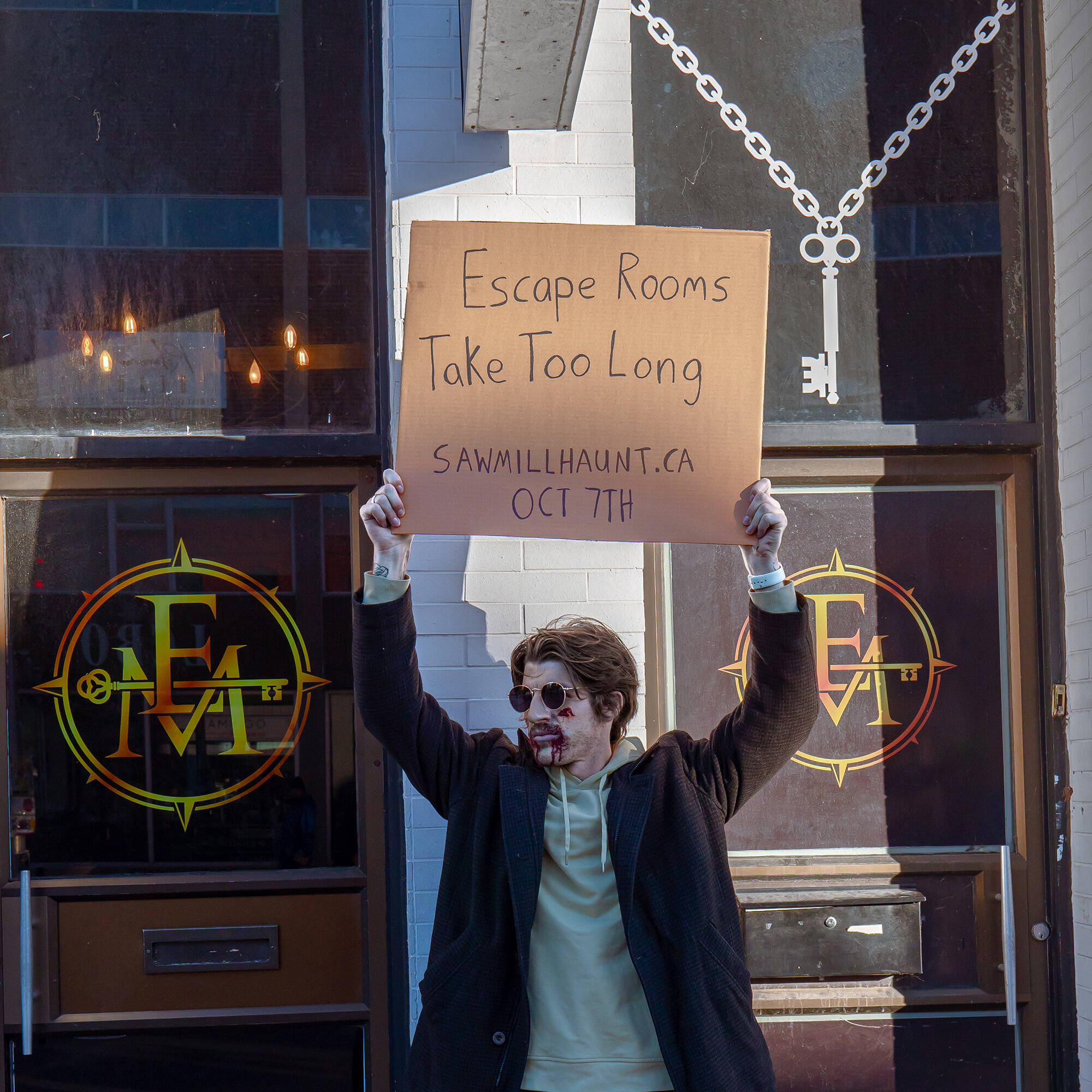 We wanted to get "Dude With Sign" to help us promote The Sawmill Haunt this year, but he wasn’t answering our calls. So we created our own influencer "Dead With Sign" to encourage people to get out of the house and do something fun this fall.