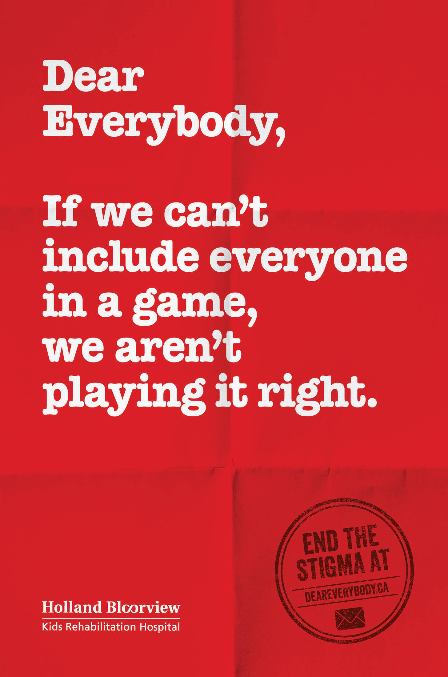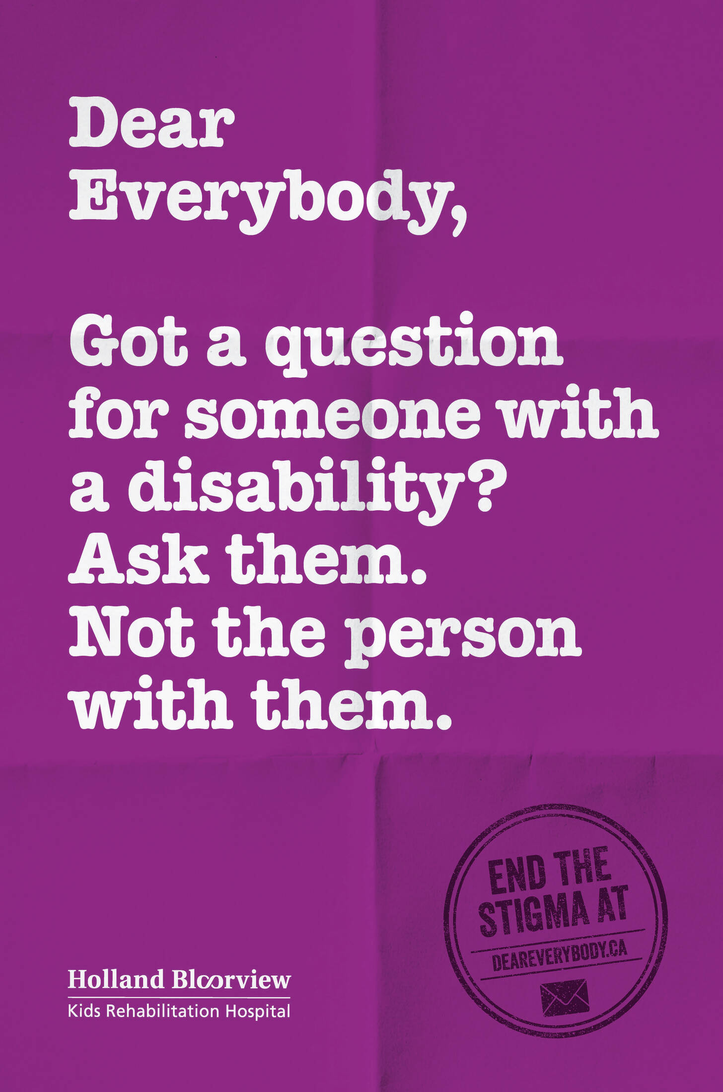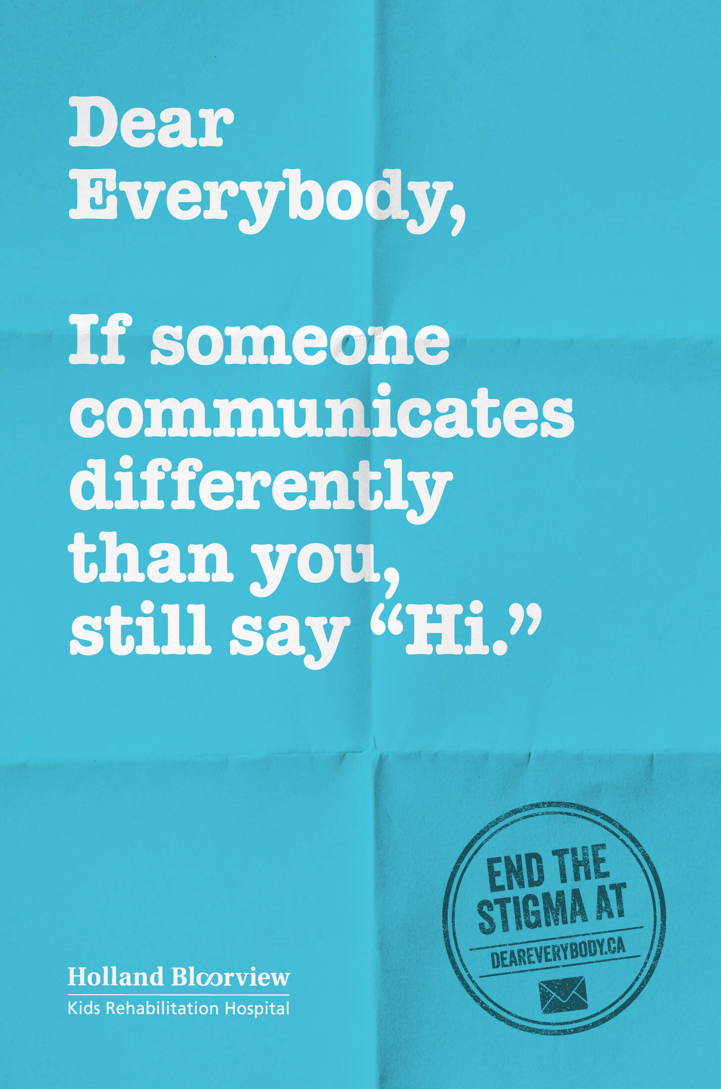 A new advertising campaign from Holland Bloorview Kids Rehabilitation Hospital is putting the voices of kids and youth front and centre in challenging stigma surrounding disability. The campaign, entitled "Dear Everybody", launched today on TV, radio, print and digital out of home and online as well as with a pop up installation in the CF Toronto Eaton Centre. The campaign is part of an overall movement focused on educating the public about the role they can play in building an including and equitable society that includes young Canadians with disabilities.