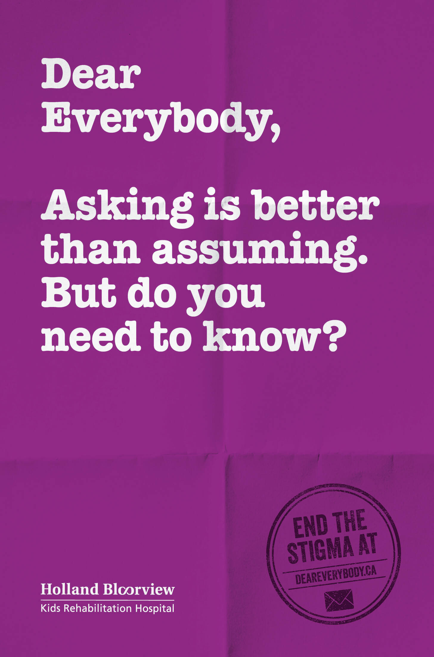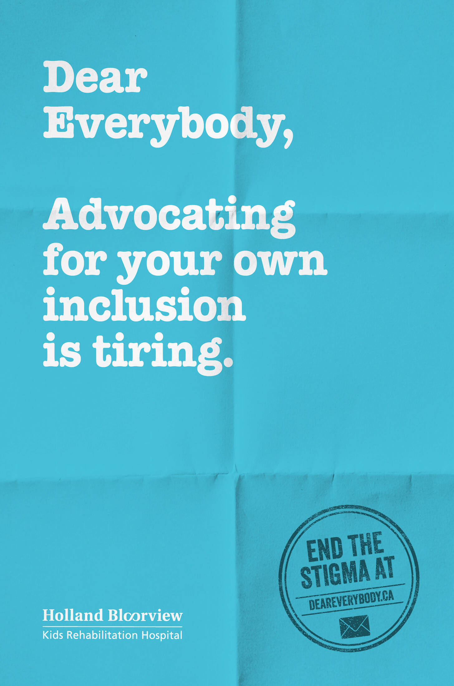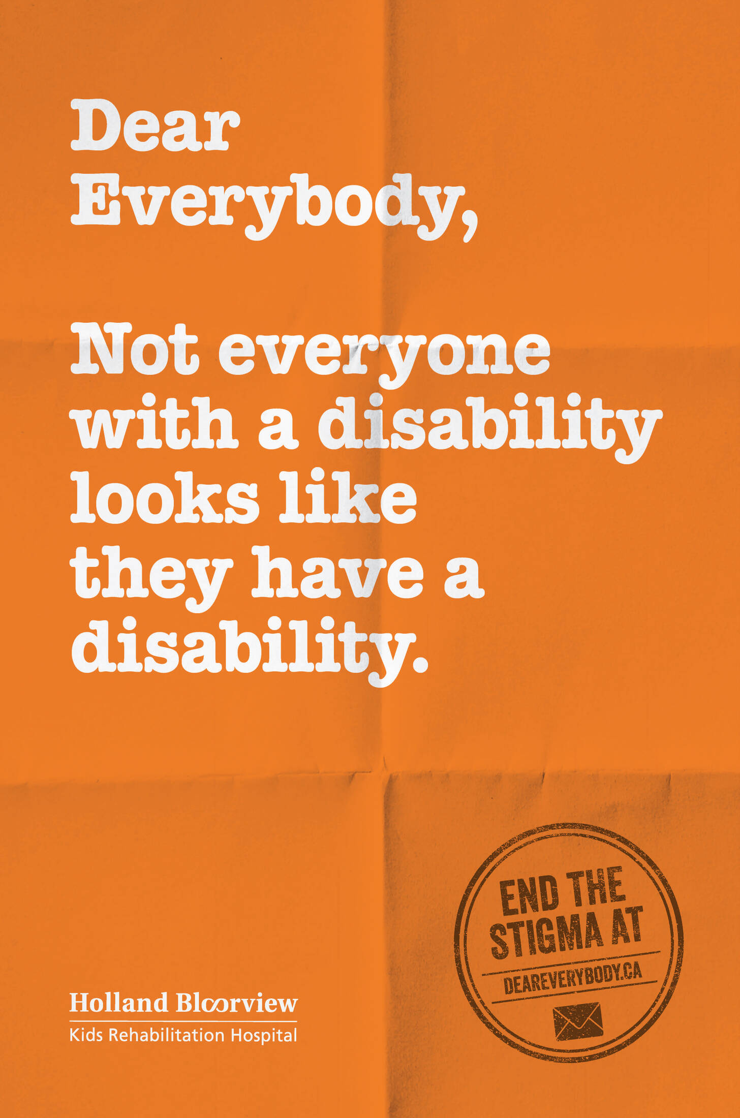 A new advertising campaign from Holland Bloorview Kids Rehabilitation Hospital is putting the voices of kids and youth front and centre in challenging stigma surrounding disability. The campaign, entitled "Dear Everybody", launched today on TV, radio, print and digital out of home and online as well as with a pop up installation in the CF Toronto Eaton Centre. The campaign is part of an overall movement focused on educating the public about the role they can play in building an including and equitable society that includes young Canadians with disabilities.