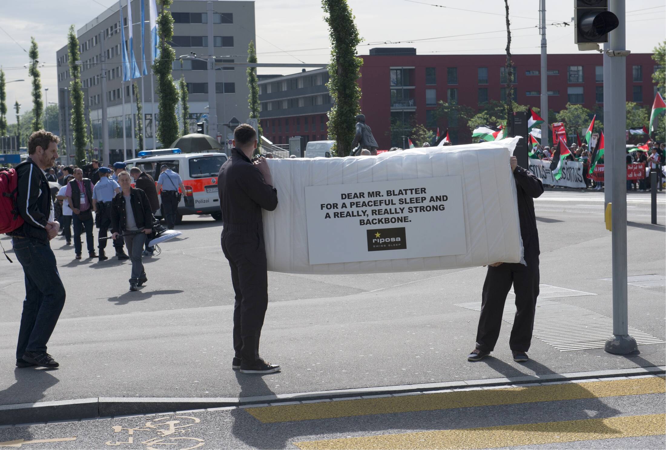 Ambient action set in scene at the FIFA congress in Zurich oln friday the 29th. Havas Worldwide pulled out all the stops to hand over a mattress manufactured by the highly profiled Swiss company Riposa to Sepp Blatter. The gift was accompanied by a personal greeting that drew attention to developing a strong backbone. The Matress with headline was also