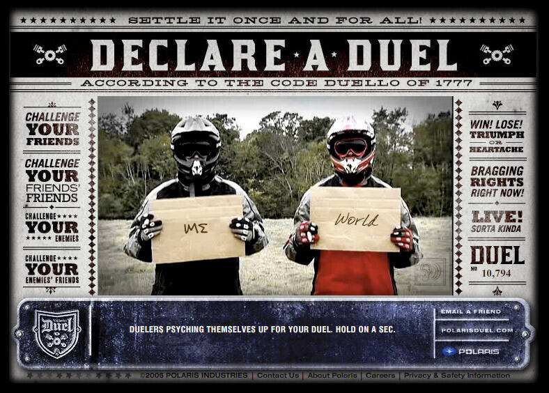 This professional campaign titled 'Declare a duel' was published on October 01, 2006. It was created by ad agency: McKinney. This Digital medium campaign is related to the Automotive and Personal Transportation industry and contains 1 media asset. It was submitted about 19 years ago.