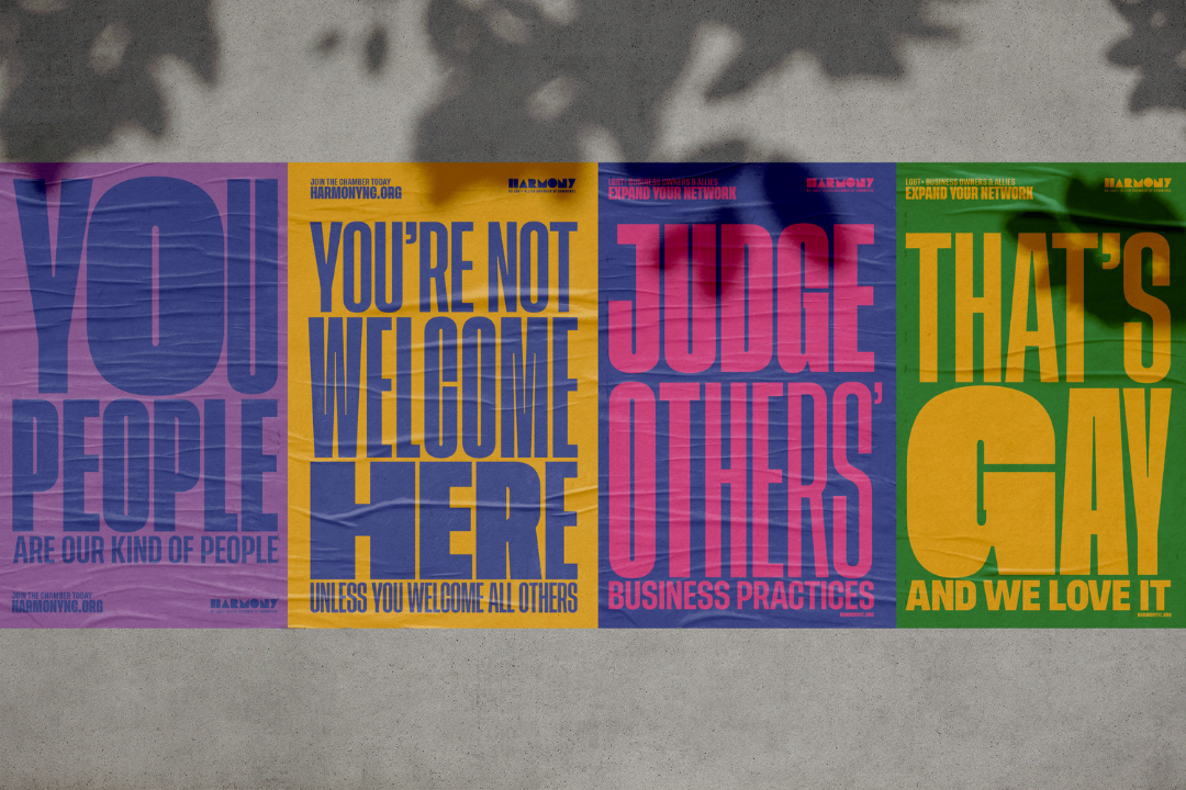 The North Carolina LGBT+ Chamber’s lingering reputation as a social club, overshadowed their business-related services, making it difficult to attract new, younger members. As visibility and impact waned, we set out to renew interest in the chamber’s mission of inspiring, supporting and engaging underserved businesspeople and their allies. Starting with a new, inclusive brand identity - HARMONY - we created a series of eye-catching messages revealing core values everyone could embrace.